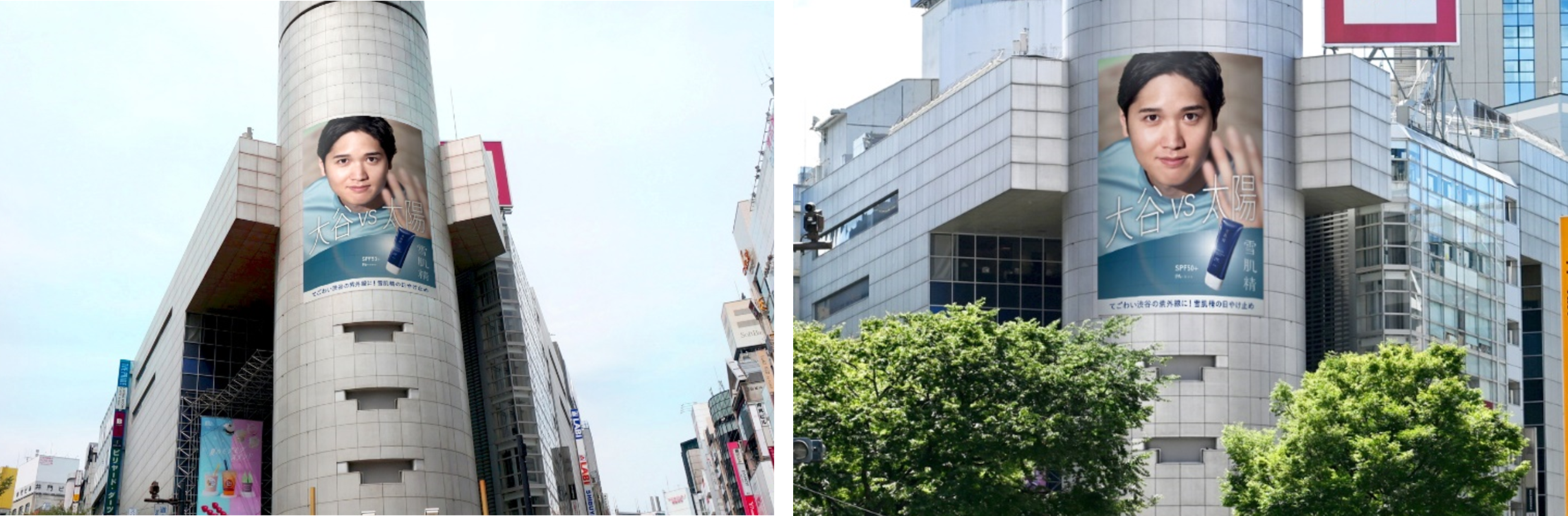 今回お披露目となる巨大広告は、東京と大阪の2か所に登場。「大谷VS太陽」のメッセージとともに、街全体を見渡せる場所に掲載される広告は、まるで大谷選手と『雪肌精』の日やけ止めが太陽に立ち向かっているようです。
