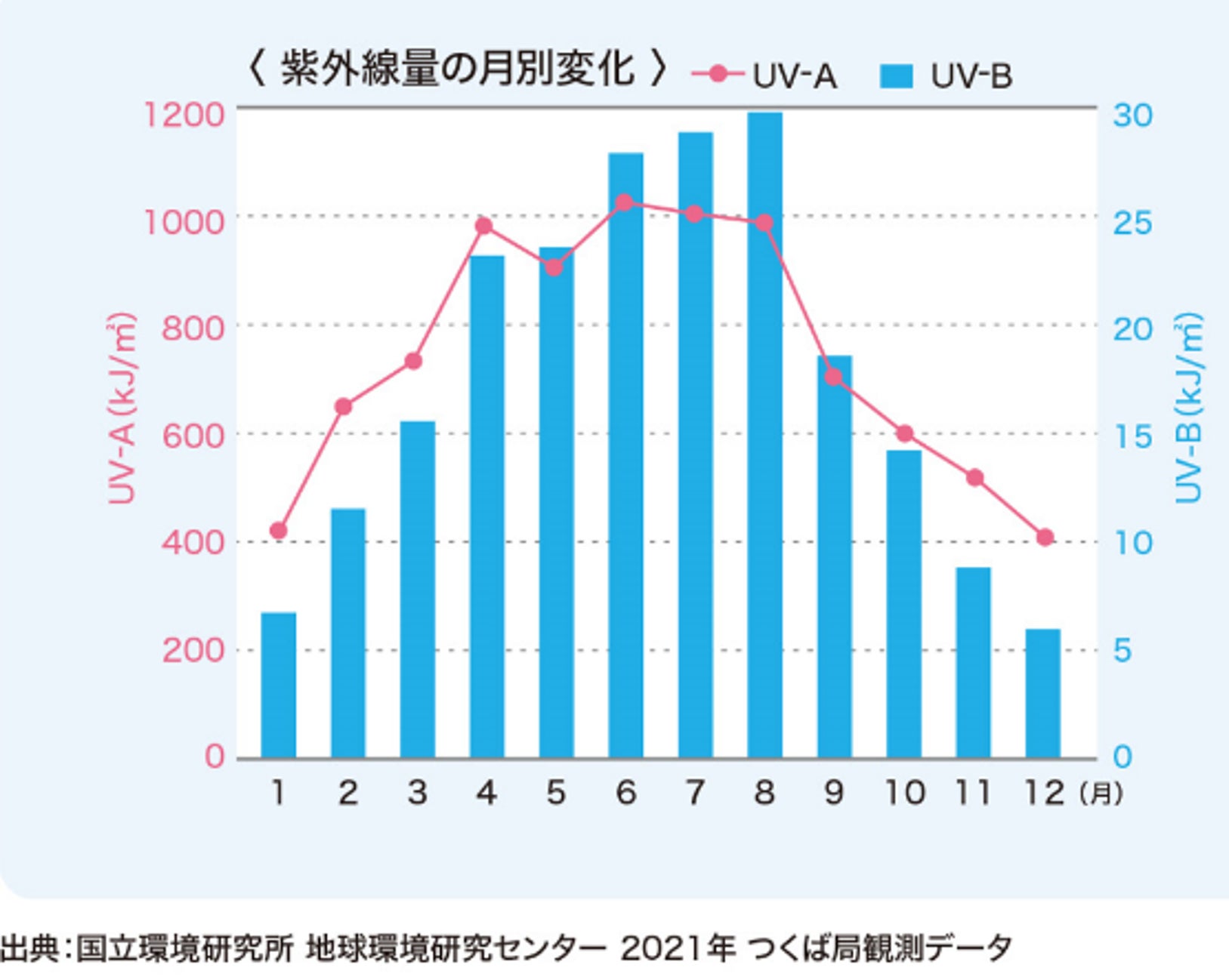 1年を通した紫外線の動きを見ると、7月、8月をピークとしながら、特に4月からは紫外線の数値が急激に高まることがわかります。春から日やけ止めを使用して肌を守ることが重要であるとわかります。