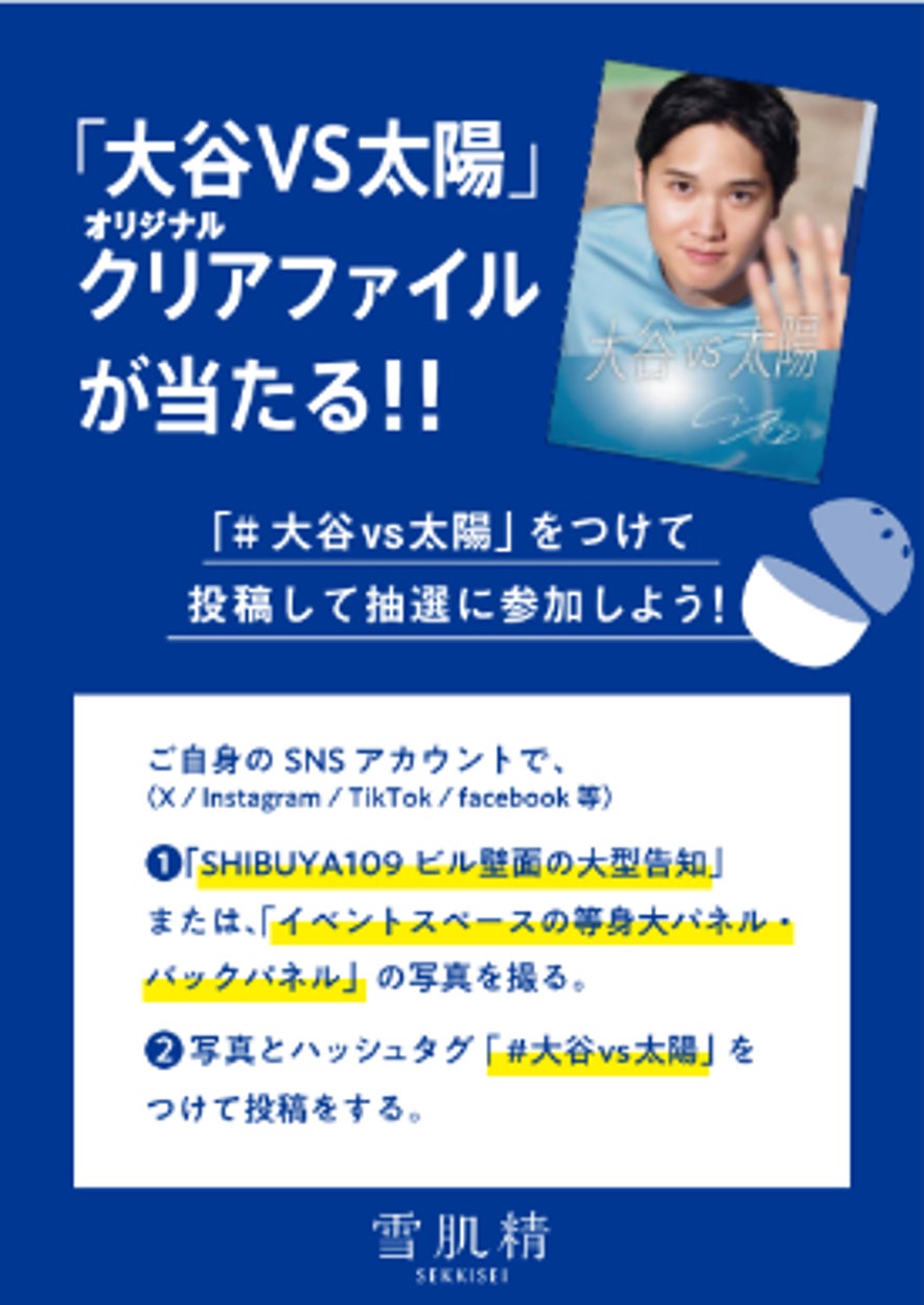 東京で巨大広告掲出中の4月20日(土)、21日(日)には、SHIBUYA109渋谷店の店頭イベントスペースにて、サンプル配布イベントを実施します。紫外線から肌を守るため、日やけ止めのサンプルや、紫外線チェッカーうちわを配布。また、当日イベントの様子をSNSで投稿すると大谷選手のクリアファイルが当たる抽選会にも参加いただけます。