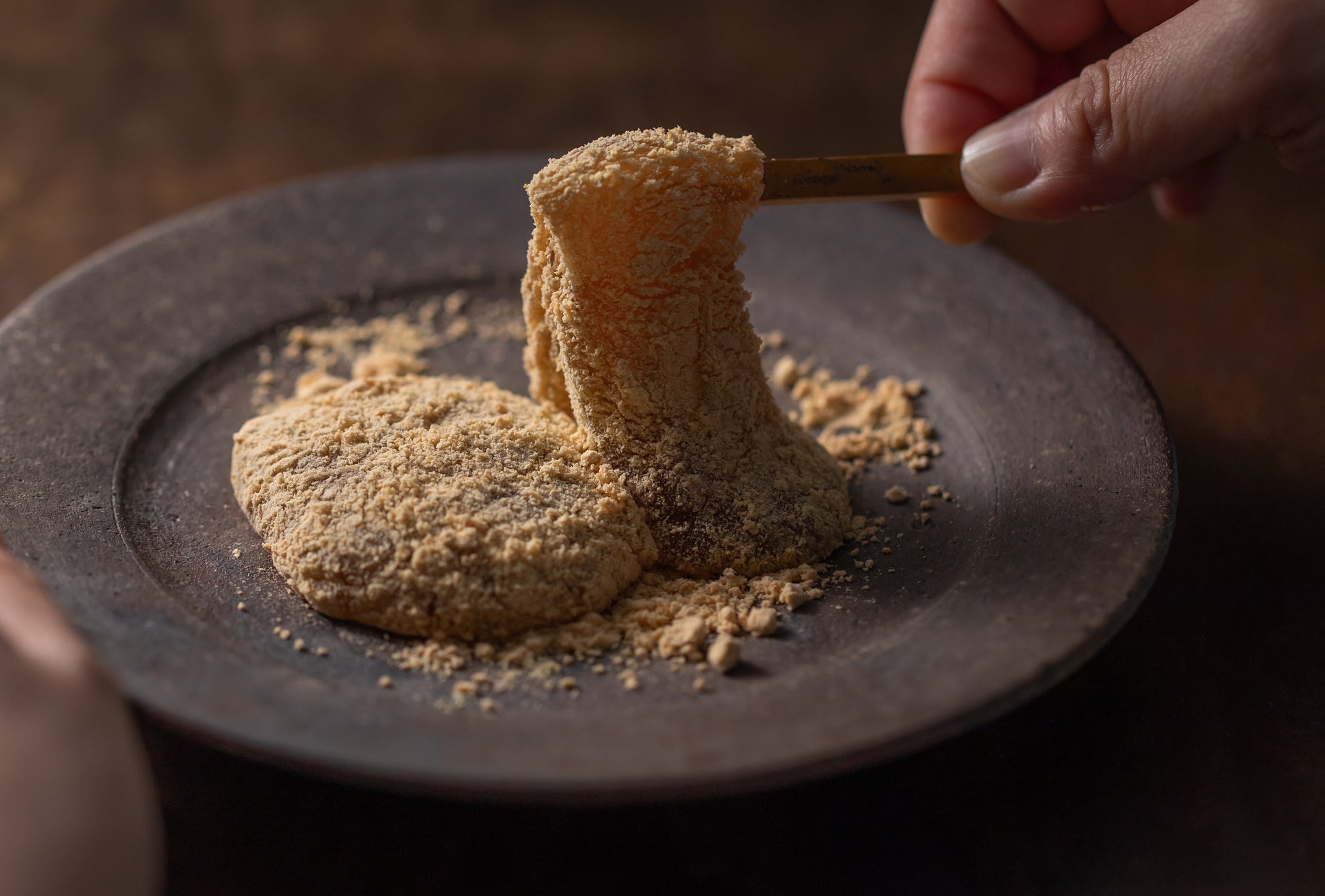 みずみずしさを閉じ込めるように丸く丁寧に手切りしたわらび餅。あふれそうなほど箱いっぱいに敷き詰めたきめ細かなきな粉は、このわらび餅のために特別に焙煎したもの。北海道産大豆とよまさりを使い、大豆本来の香りと甘みを生かしています。わらび餅のとろけるようなふわふわ食感、沖縄県波照間島産の純黒糖のほのかな余韻、風味豊かなきな粉との調和をどうぞお楽しみください。これまでの集大成として、素材・箱・作り方すべてにこだわった本物志向のわらび餅です。