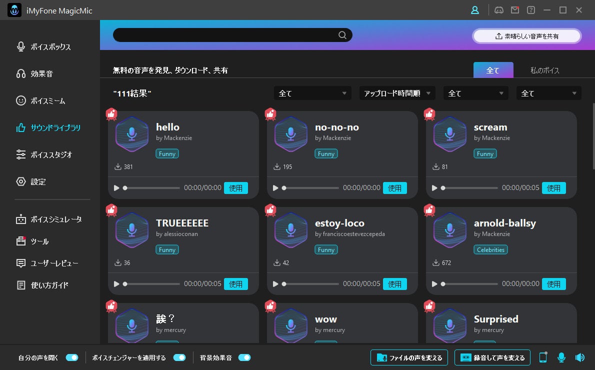 効果音、背景音の再生、インポート、共有、ダウンロード