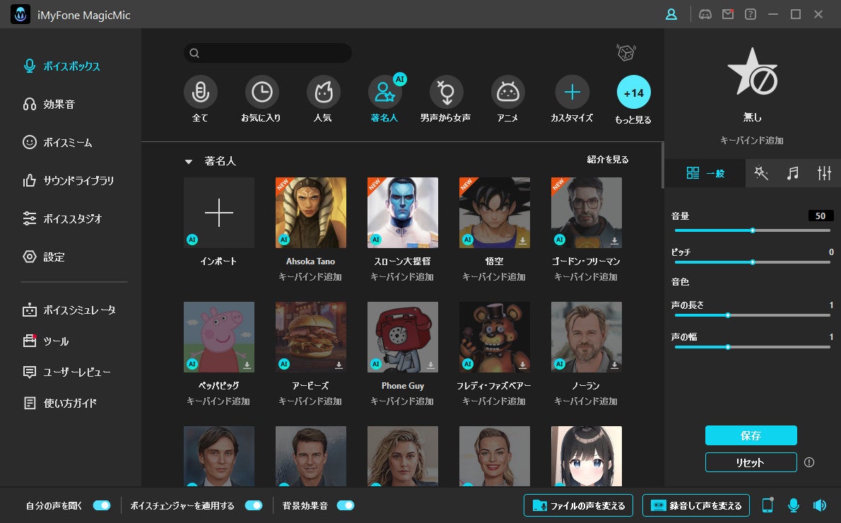 100個を超える有名人や俳優、歌手による音声データを基に機械学習を用いたAI音声エフェクトを追加しました。リアルタイムに変換できる以外、同時に録音と保存も可能です。