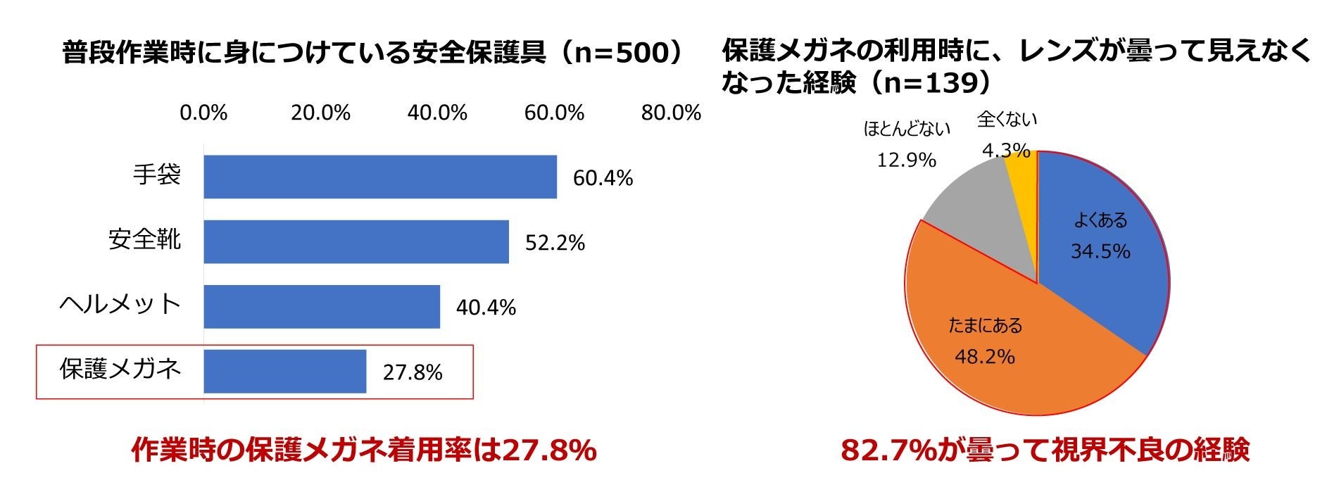 当社が2024年7月、日常業務で作業を行っている500名の作業者様に調査を行ったところ、保護メガネの重要性は全体の62%が実感している一方、実際の着用率は27.8%にとどまる結果となりました。また保護メガネ利用者の82.7%がレンズの曇りに困っており、眼の紫外線対策をしている方も35.9%にとどまることが分かりました。
