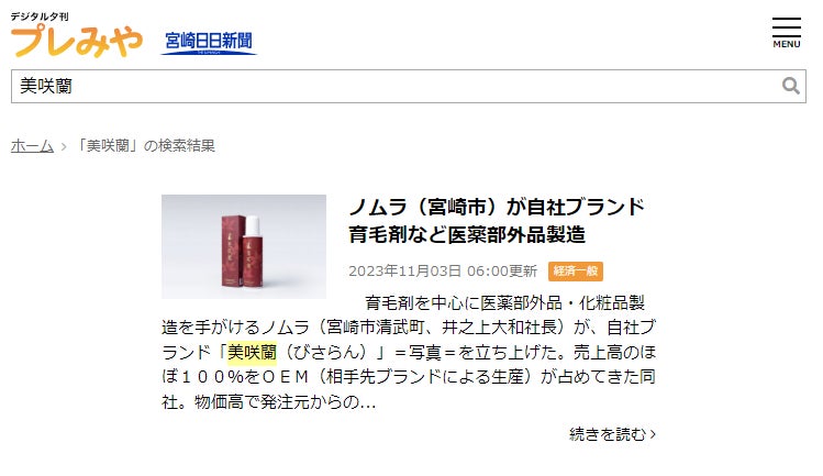2023年10月2日、日本初※2の育毛剤「美咲蘭 薬用RNエッセンス」を発売。OEMから自社ブランドへ方向転換を行った取組みを宮崎日日新聞社様に取材していただき、11月3日の経済面に記事が掲載されました。