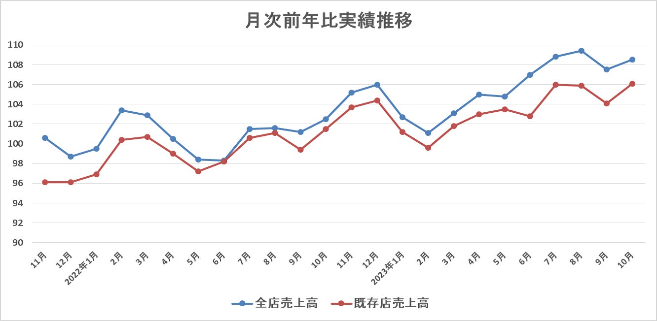 2023年6月から全店売上高に株式会社ハツトリーの実績を合算し、全店売上高は8.5%増だった。