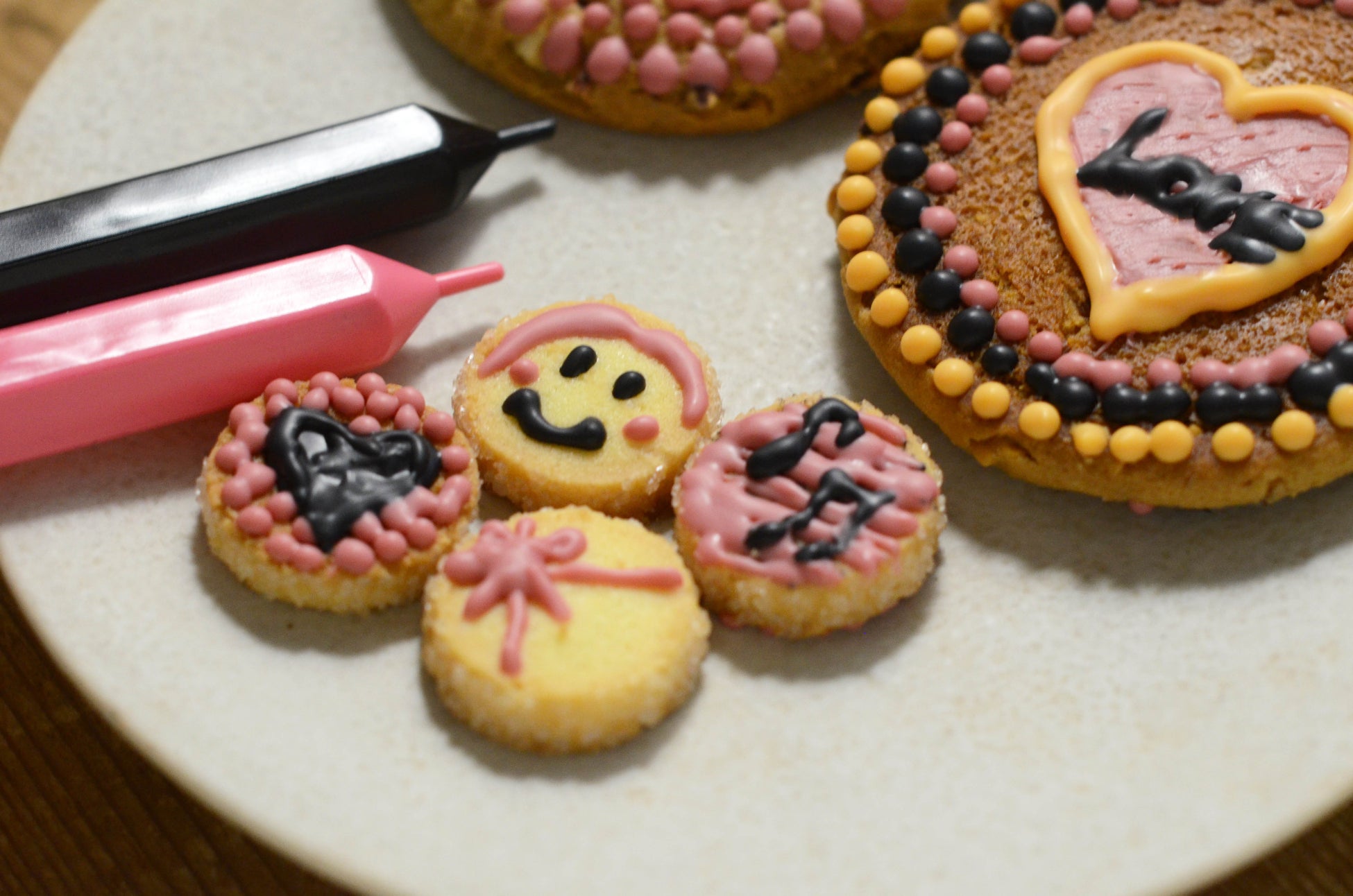 クッキーとチョコペンをセットで販売します。会場内のスペースで見本を見ながらデコレーションできるほか、用意してあるラッピング用品を使ってバレンタインらしく包装することもできます。もちろん持ち帰って再度デコレーションをすることも可能です。
