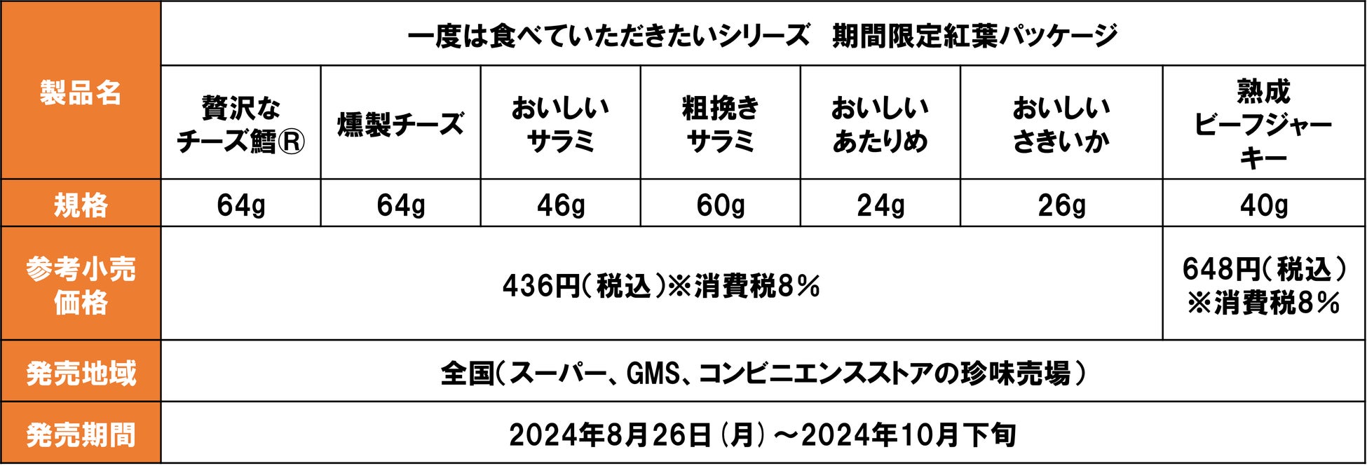 株式会社なとり(本社:東京都北区 会長兼社長:名取三郎)は、「期間限定紅葉パッケージ 一度は食べていただきたいシリーズ」を8月26日(月)より順次発売いたします。