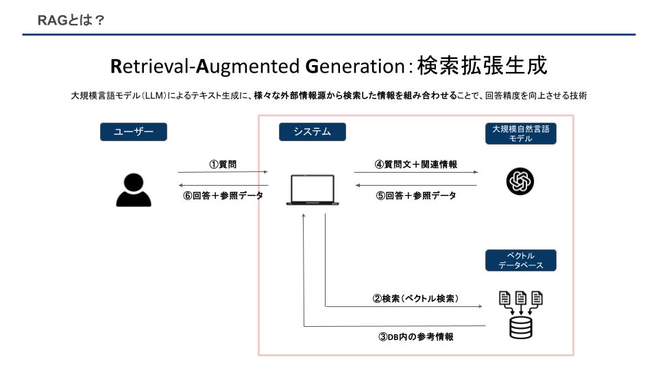 RAG(Retrieval-Augmented Generation)は、大規模言語モデル(LLM)によるテキスト生成に、外部情報の検索を組み合わせる技術です。この技術を用いることで、ユーザーの質問に対して独自の情報を引用し、自治体や企業などの独自のルールに対応した回答が生成されやすくなります。