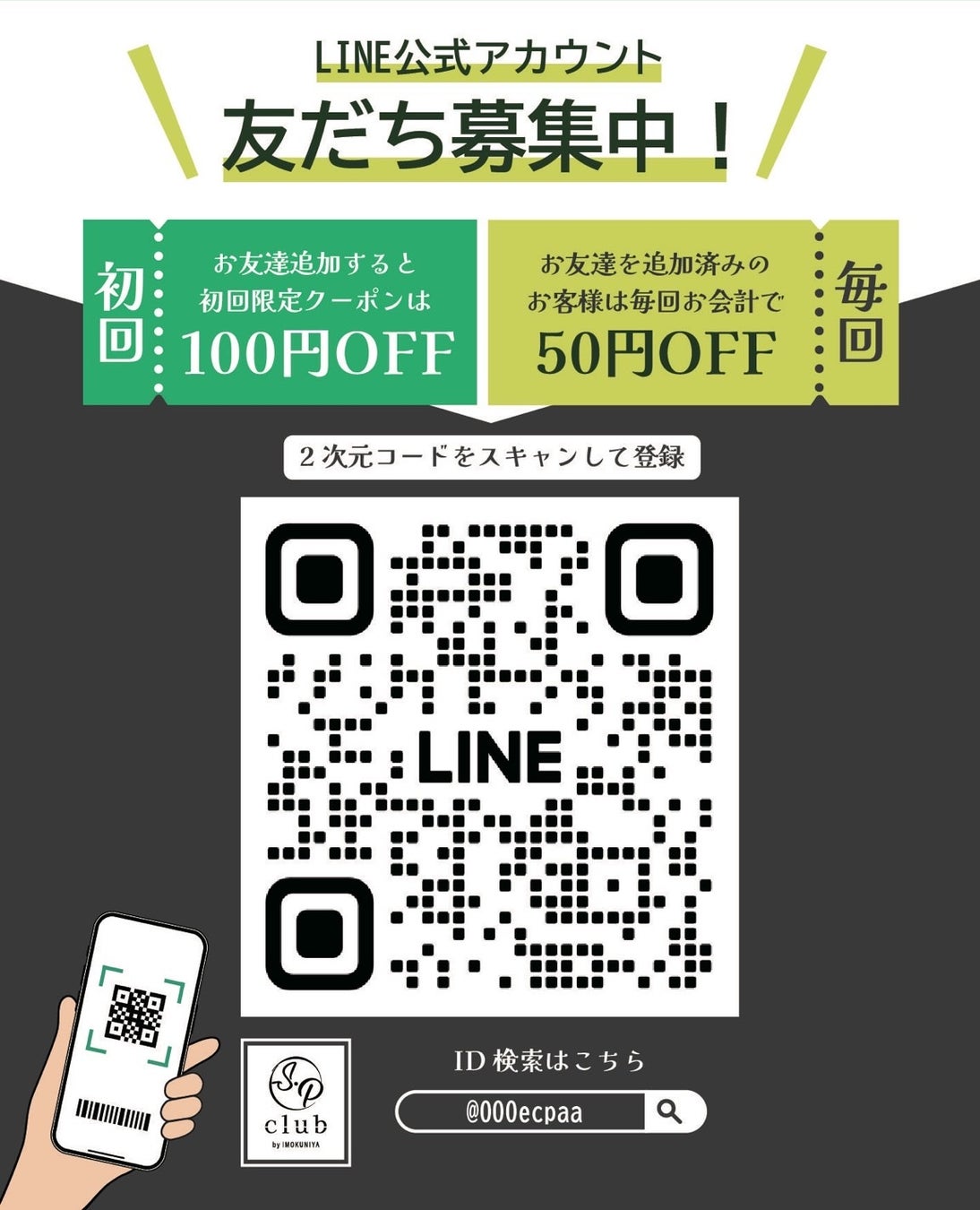 ③S・P club公式LINEのお友達追加で100円OFF!(※②の3商品は特別価格から、さらに100円割引)