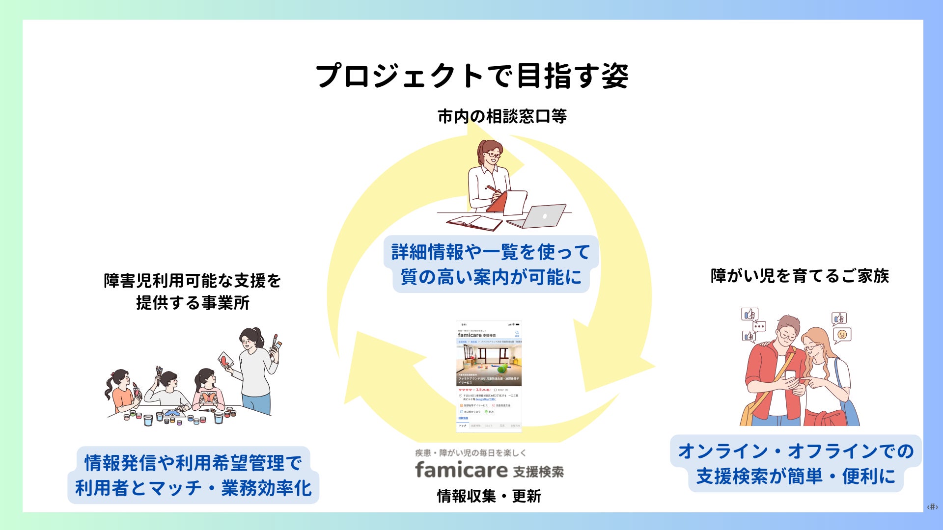本プロジェクトでは、障がい児家族と支援事業者(児童発達支援・放課後等デイサービス・短期入所・訪問看護・訪問介護等)をつなぐマッチングサービス「ファミケア支援検索」を市内で導入・活用し、事業所の特徴や空き状況を見える化することで豊川市内の障がい児における医療・福祉環境の向上を目指します。