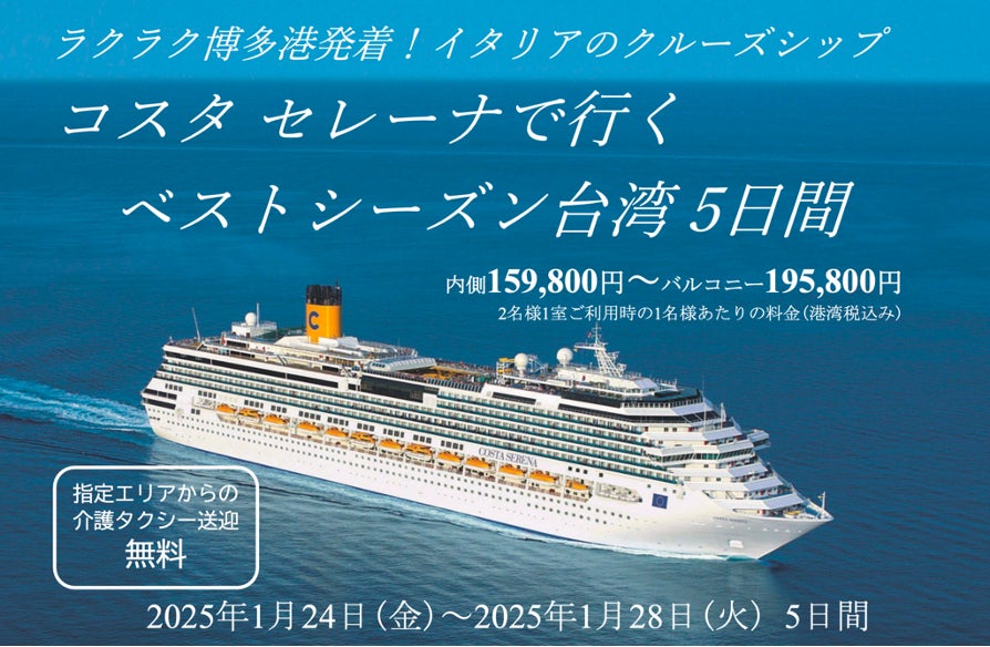 医療従事者による付き添い旅行サービス「そいたび」を展開する株式会社MIMSAPORT(本社:福岡県福岡市、代表取締役:上仮屋 遥)は、外国船・日本船のクルーズ旅行を専門とする株式会社ビュート(本社:千葉県千葉市)との業務提携により、医療従事者が24時間体制で付き添う国際クルーズ旅行サービスを開始することをお知らせいたします。第一弾として、2025年1月24日より、イタリアの大型クルーズ船「コスタ セレーナ」による博多港発着の台湾クルーズ旅行を実施いたします。ご興味がおありの方は、お気軽にお問合せください。