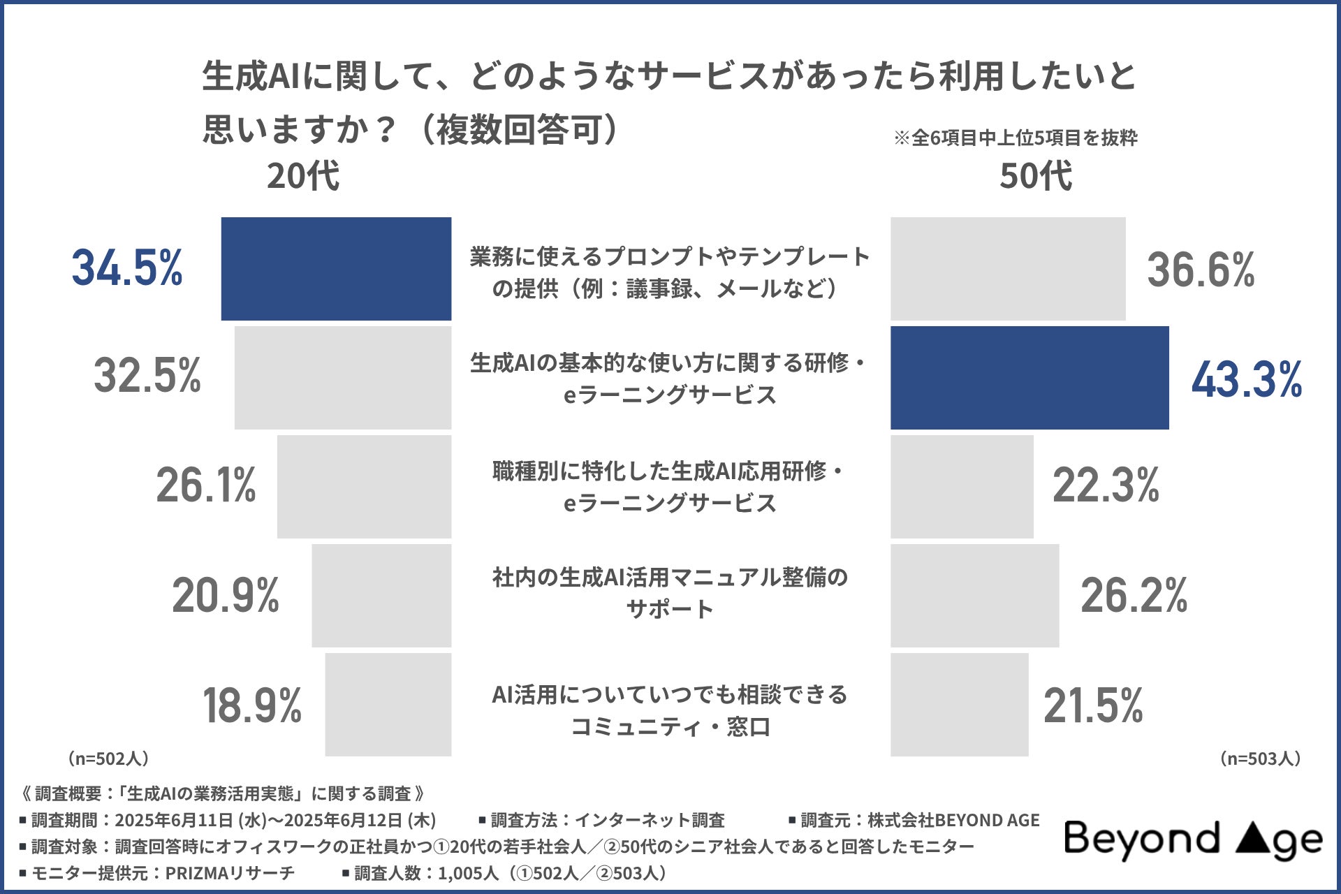 最後に、「生成AIに関する支援ニーズ」について尋ねたところ、20代では『業務に使えるプロンプトやテンプレートの提供(34.5%)』が最多となり、50代では『生成AIの基本的な使い方に関する研修・eラーニングサービス(43.3%)』が最多となりました。
