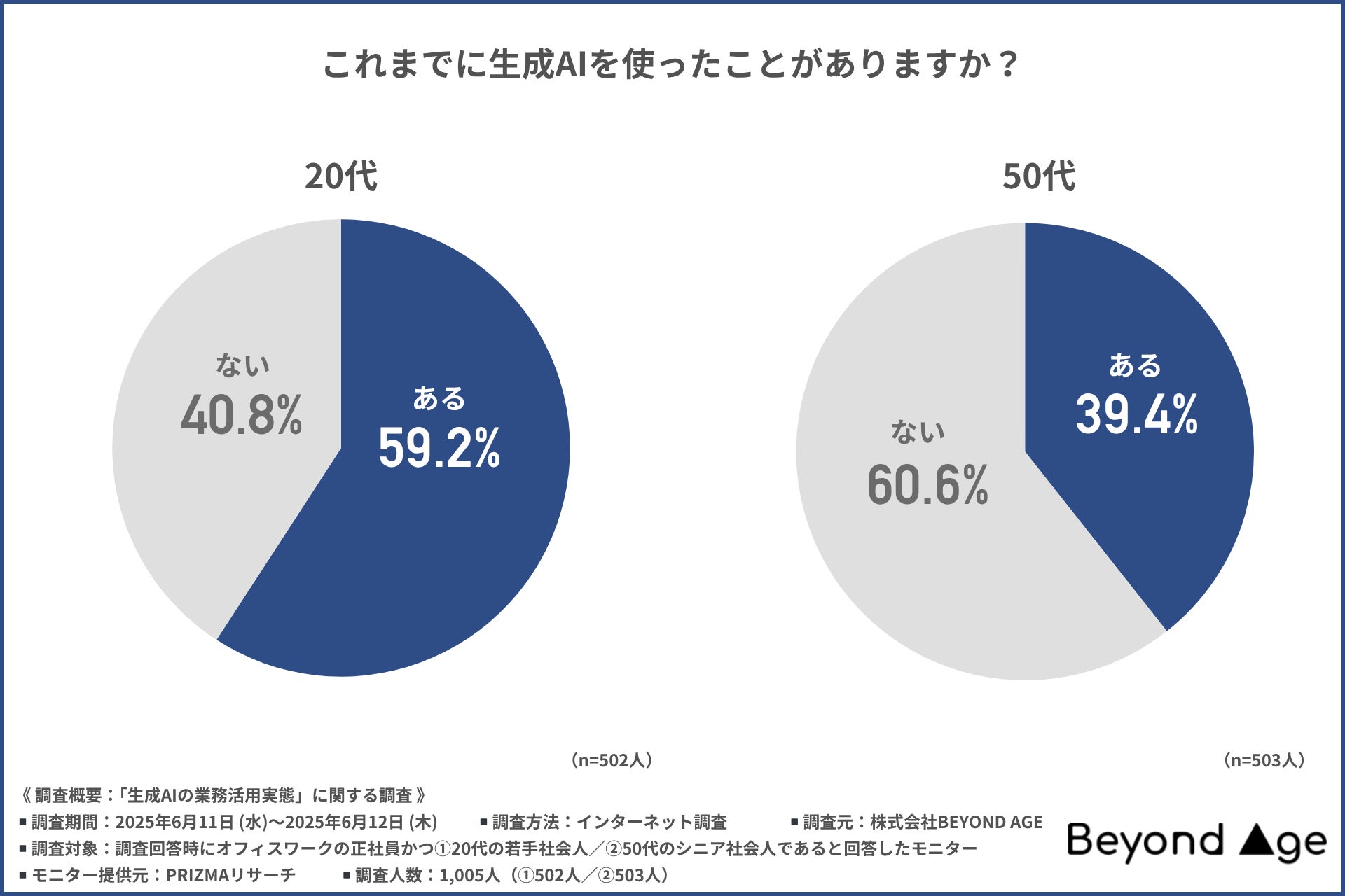 そこで今回、オウンドメディア「シニア独立100万人」を運営する株式会社BEYOND AGEは、20代の若手社会人と50代のシニア社会人を対象に「生成AIの業務活用実態」に関する調査を行いました。