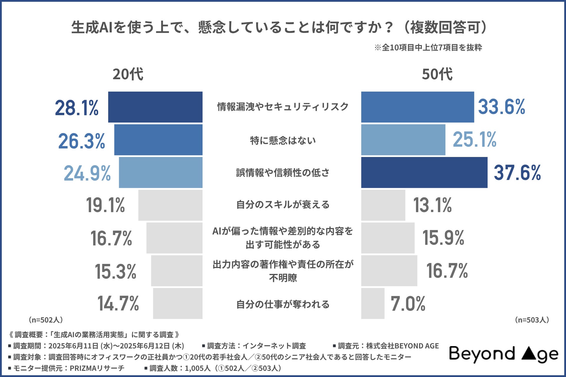 生成AIに対する懸念点、20代は「情報漏洩・誤情報」、50代は「信頼性・セキュリティ」が中心
