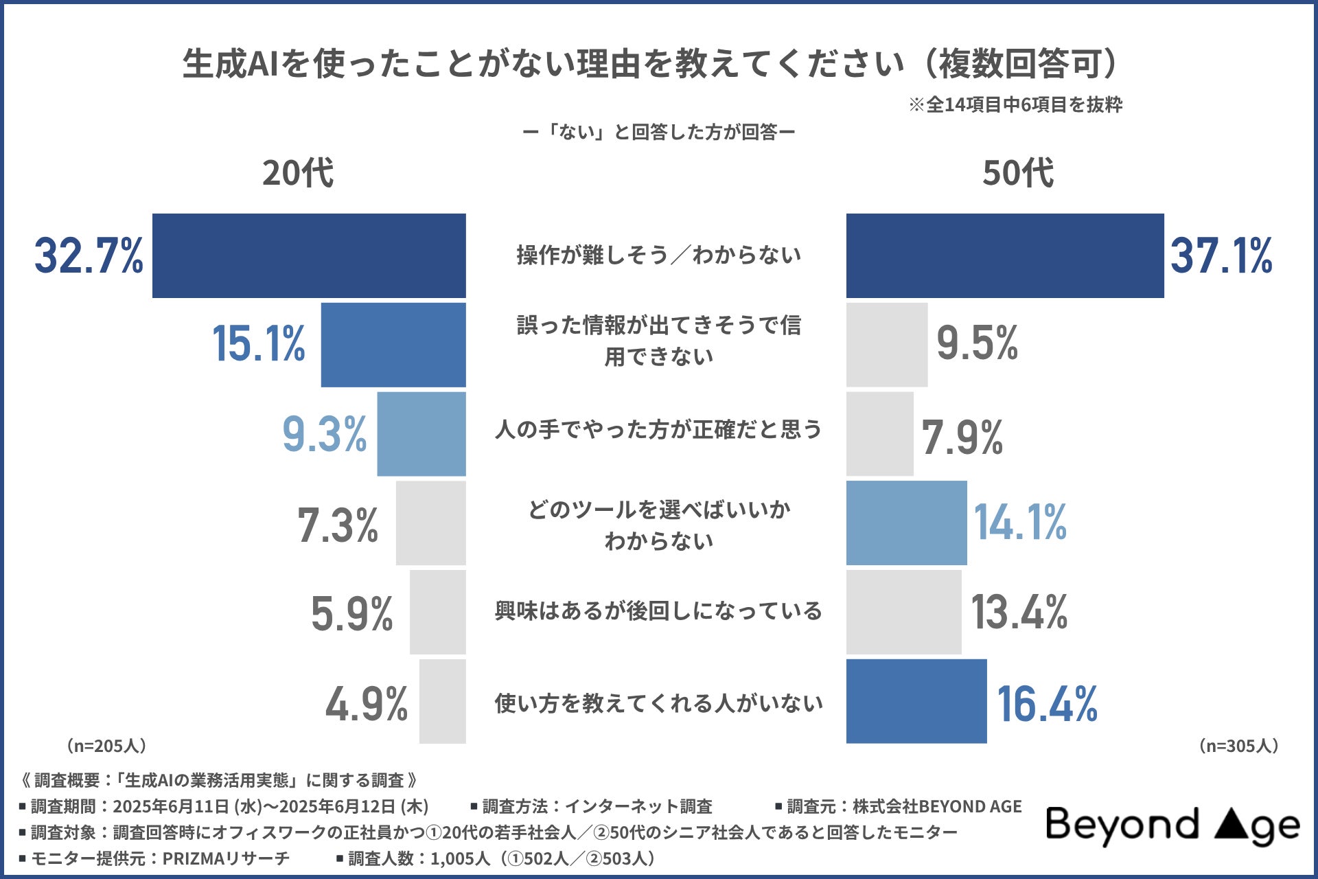 対して50代では「使い方を教えてくれる人がいない」「どのツールを選べばいいかわからない」といった、導入環境が整っていないことが、活用を妨げる要因となっているようです。