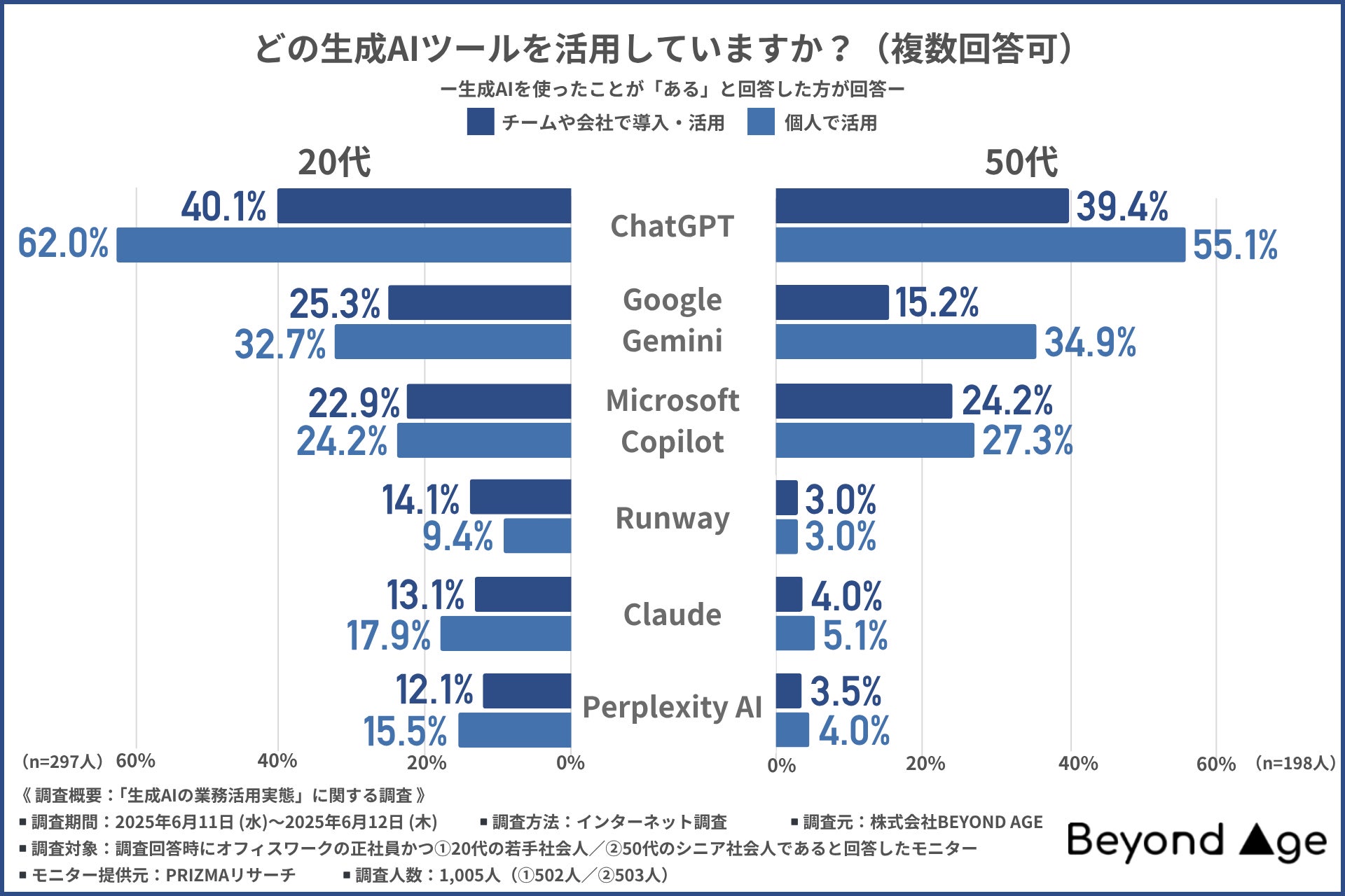 株式会社BEYOND AGE(所在地:東京都中央区、代表取締役:市原 大和)は、20代の若手社会人と50代のシニア社会人を対象に「生成AIの業務活用実態」に関する調査を行いました。
