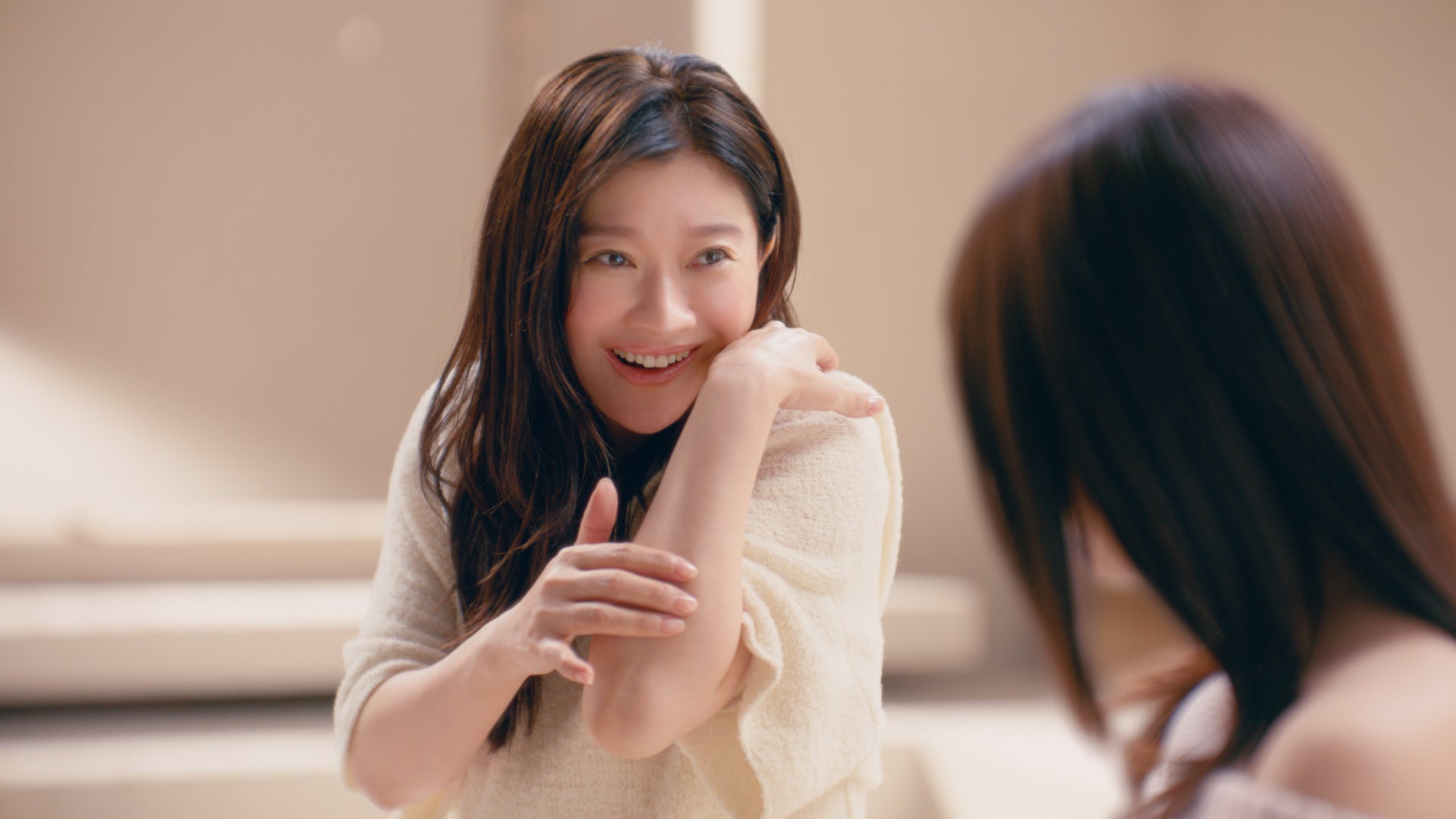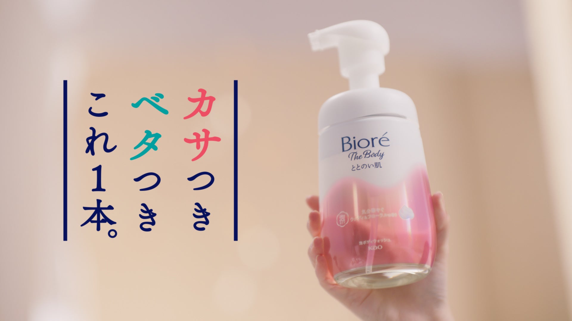 篠原さんが、カサつきやベタつきを感じなくなったことに驚く様子からスタート。そこに橋本さんが「『ビオレ ととのい肌』で洗ってますから!」と言って商品を差し出します。手で洗うだけで、カサつきとベタつきを同時にととのえる『ビオレ ザ ボディ ととのい肌』。さらに、すすいだ後に現れる“水ツヤ*1のヴェール”が、カサつきを防ぎ、ベタつきを抑えるという機能を解説。『ビオレ ザ ボディ ととのい肌』1本で肌がととのっていく様子を「水ツヤのヴェール」篇(30秒)で表現しています。