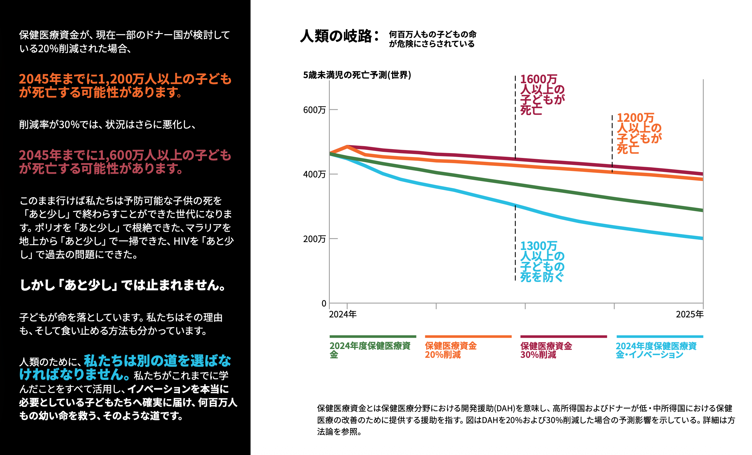 私たちは人類史上最も先進的な科学やイノベーションを手にした世代でありながら、それを命を救うために活用する資金を確保できなかった世代となってしまうかもしれません。適切な優先順位とコミットメントと共に、高効果のソリューションに投資すれば、子どもの死亡数増加という重大な逆転を食い止めることができ、2045年により多くの子どもたちが生きている世界を実現できると確信しています。