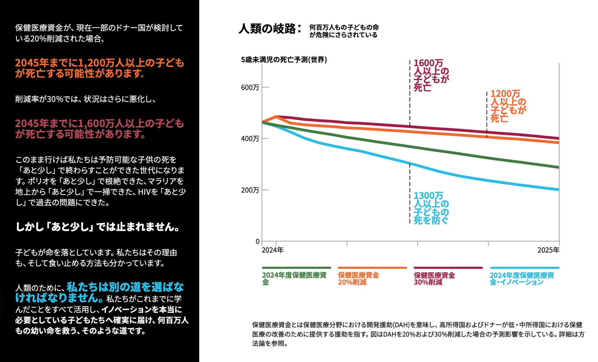 「We Can’t Stop at Almost(“あと少し”では終われない)」と題された本レポートは、もし世界の保健医療への資金削減が続けば、2045年までにさらに最大1,600万人の子どもが死亡する可能性があると警告しています。同時に、実証済みのソリューションや次世代のイノベーションに対する戦略的投資が、限られた予算環境の中でも進歩の後退を防ぎ、数百万人の命を救う道筋となり得ることを示しています。