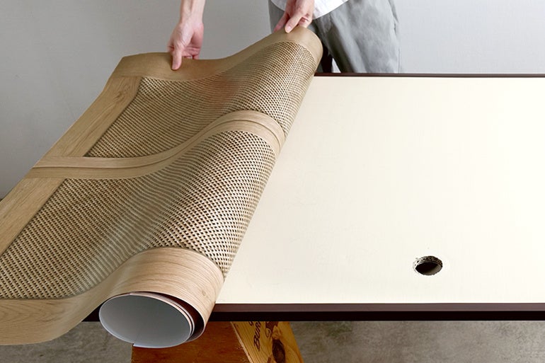 ふすまリメイクシートは、裏面の剥離紙をはがしながらふすま本体にゆっくりと貼り進め、余分をカットするだけ。