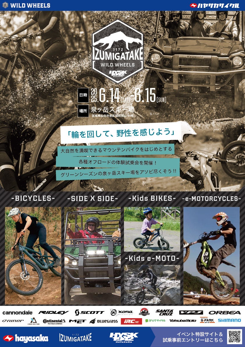 オートバイ・自転車を販売および修理する「ハヤサカサイクル」を運営する株式会社早坂サイクル商会(本社:宮城県仙台市、代表取締役:早坂 武)は宮城県仙台市泉区の泉ヶ岳スキー場にて、マウンテンアクティビティを体感できるサイクル&モビリティ イベント「WILD WHEELS in 泉ヶ岳スキー場」を2025年6月14日(土)、15日(日)に開催する。