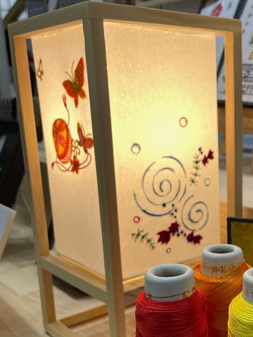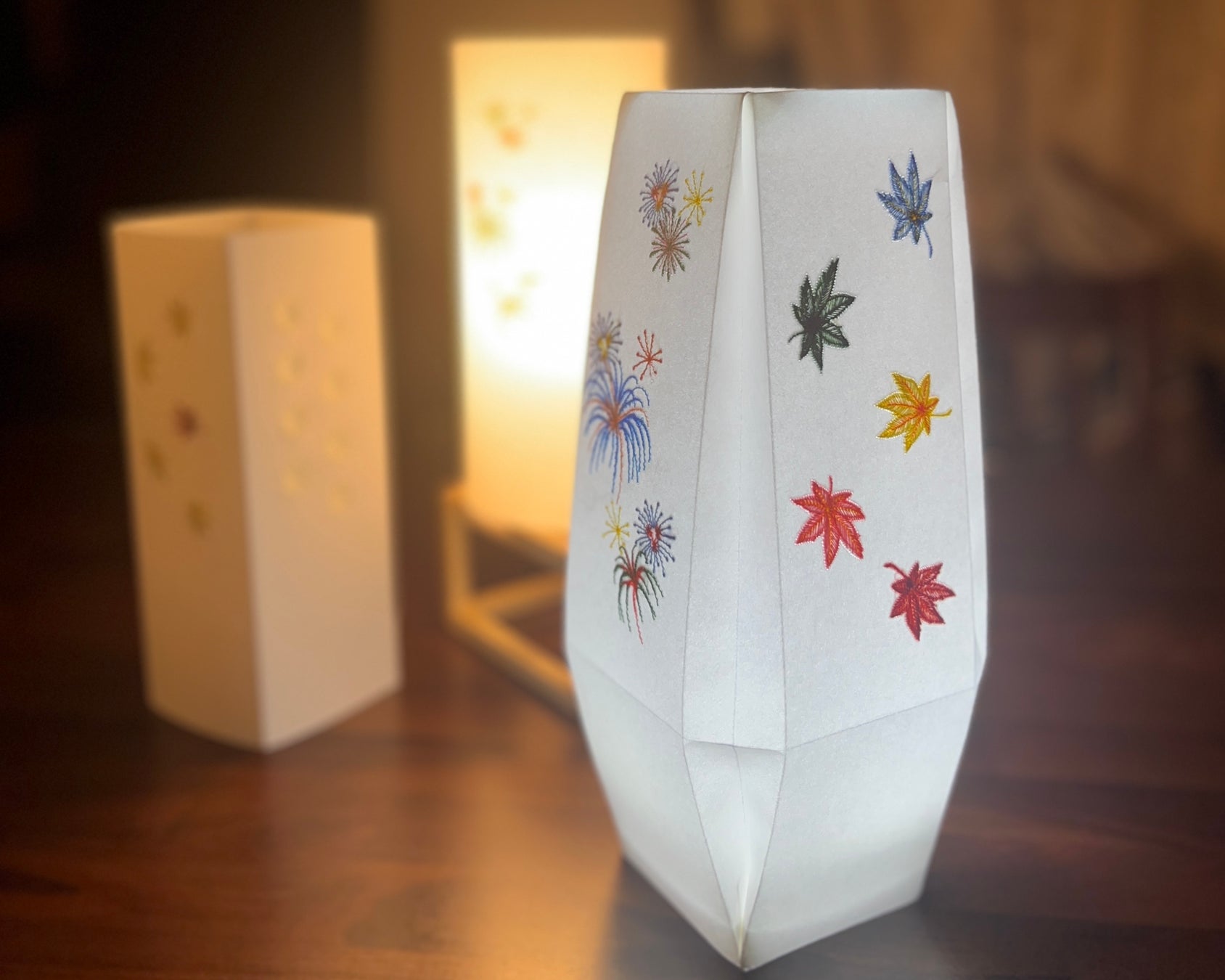 和紙の柔らかな透け感と刺繍の繊細な立体感が織りなす、幻想的な灯りを楽しめる特別なアイテムです。