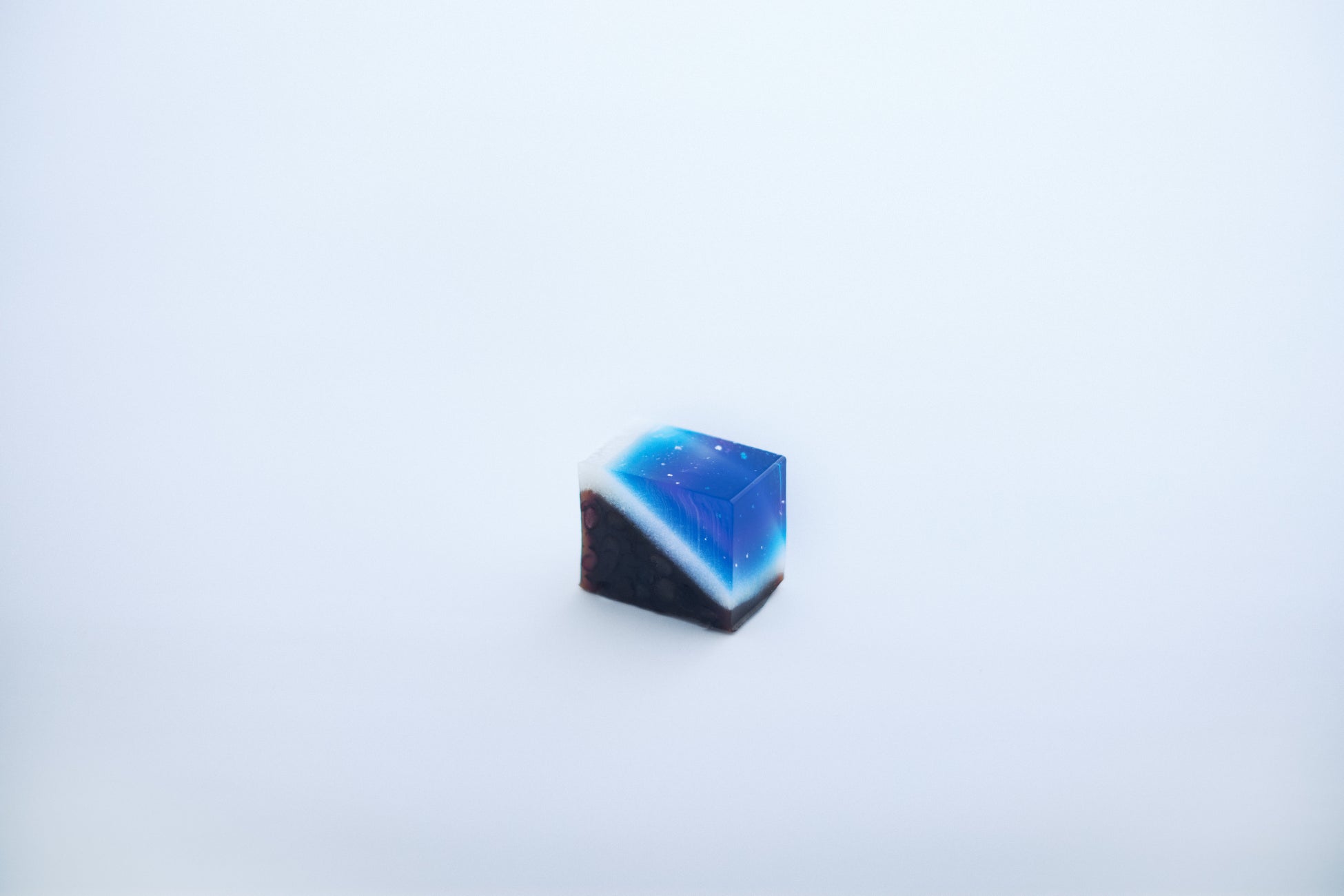 「京羊羹 天の川」は、小倉羹・白色の味甚羹・青色と赤色の琥珀羹を斜めの層にして作った和菓子となります。茶色い小倉羹を大地に見立て、その上に白色の味甚羹、さらに濃い青や赤で色づけした琥珀羹を重ね、複雑で神秘的な夏の夜空を表現しています。また、銀箔の星を散りばめ、揺らめく星屑をイメージした七夕の世界を描いております。