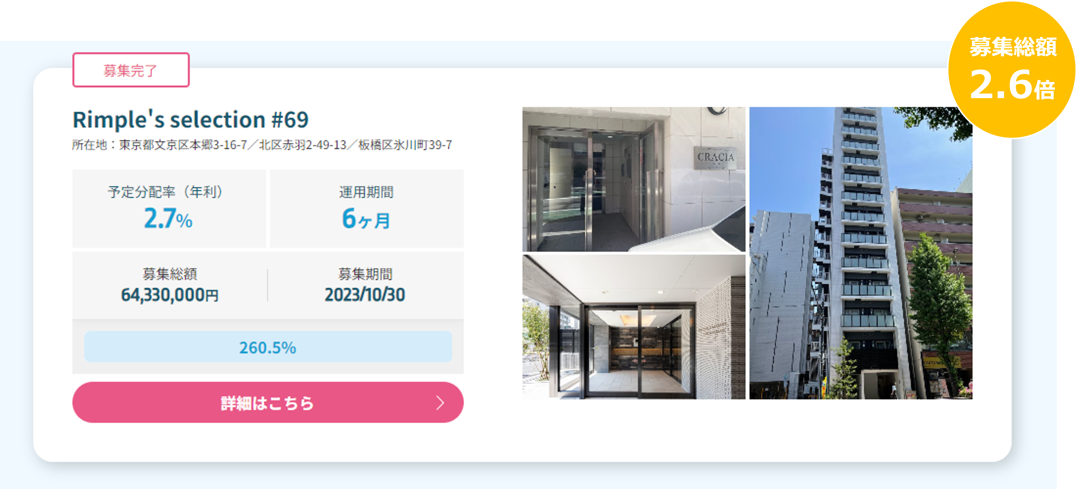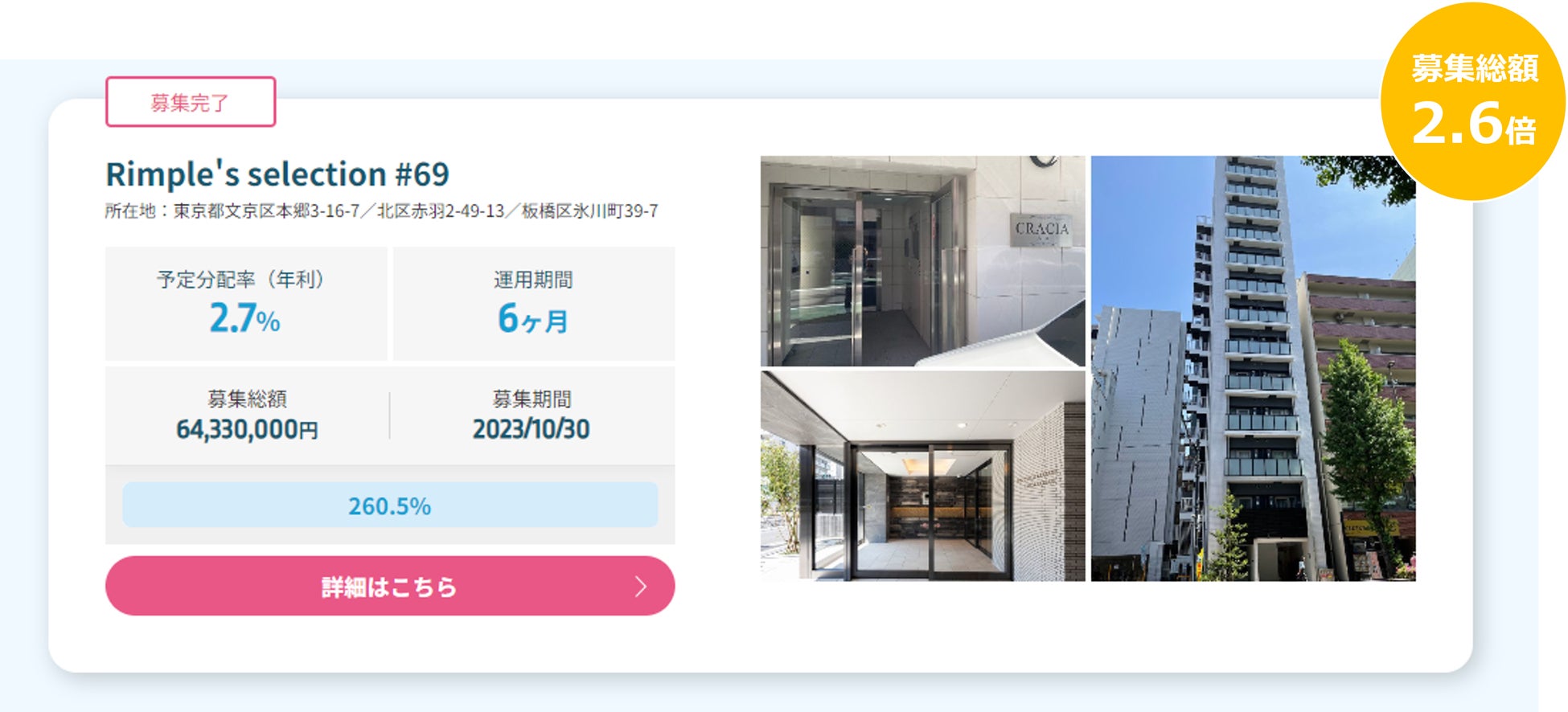 プロパティエージェントの展開する不動産クラウドファンディング Rimple‘s Selection#69 募集総額260.5%の1.67億円の応募