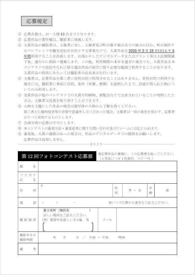 (3) 入賞作品の撮影者は、主催者に対し、主催者及び町が催す展示会での展示のほか、町が制作するパンフレットや観光宣伝を目的とする事業などで、入賞作品を2025年2月23日(日曜日)より5年間利用することを許諾します。お預かりしたデータまたはプリントなどは上記期間満了後、すみやかに削除・廃棄します。この他、利用期間の5年を過ぎた場合でも、入賞作品を本コンテストの宣伝やそれに係る過去作品の紹介に限り必要な範囲で利用することがあります。入賞作品の利用にあたっては、撮影者の氏名表示を行います。
