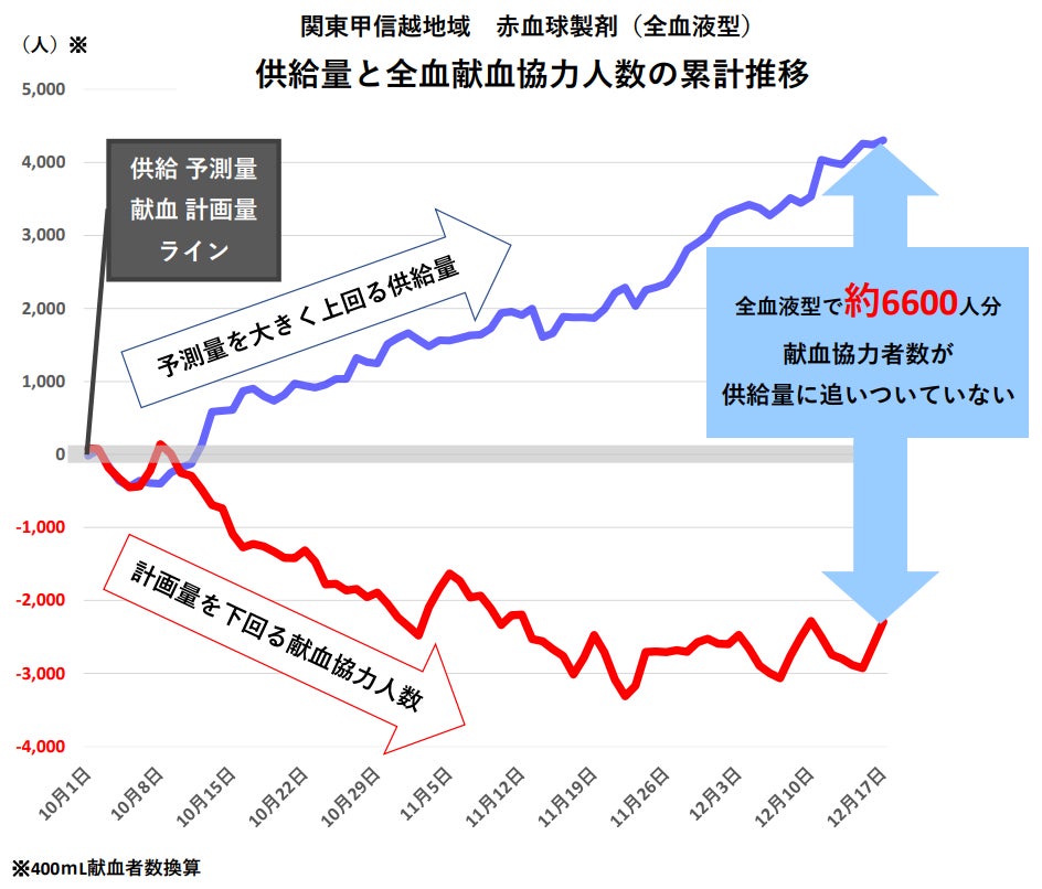 関東甲信越地域(1 都 9 県)では12 月に入り、医療機関への赤血球製剤の供給量が急増しており、今後も予測を大きく上回る供給量が見込まれます。