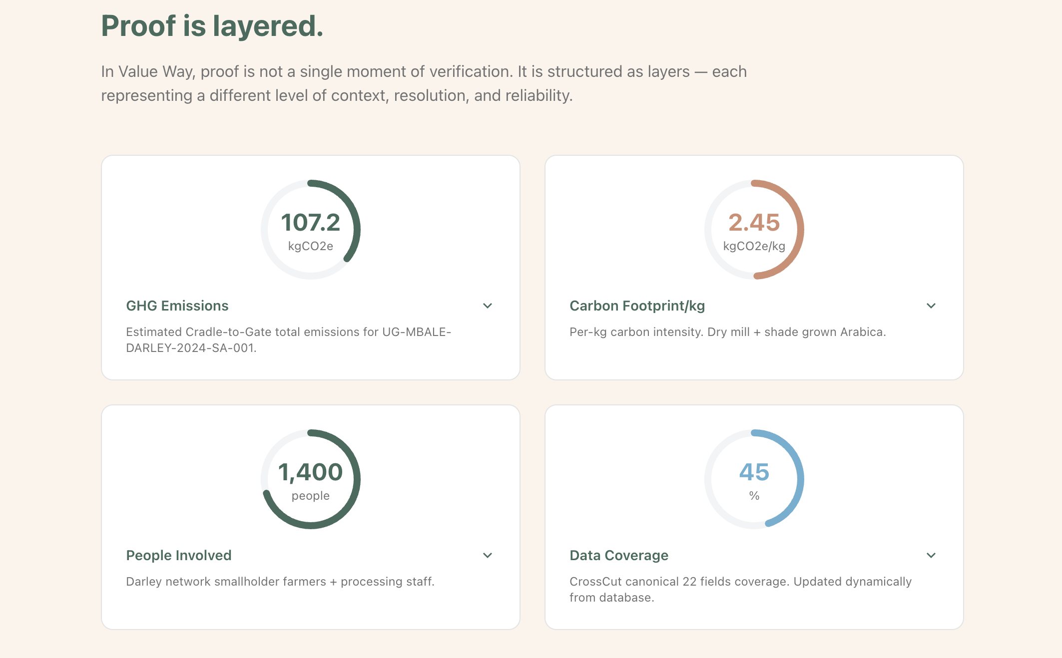 Value wayは、 気候変動によりコーヒーグローバル調達の不確実性が高まるなか、ロットの可視化、物語化、森林・気候リスク、CO2表示を通じて、コーヒーの未来を支える新たな共通基盤構築を目指します。
