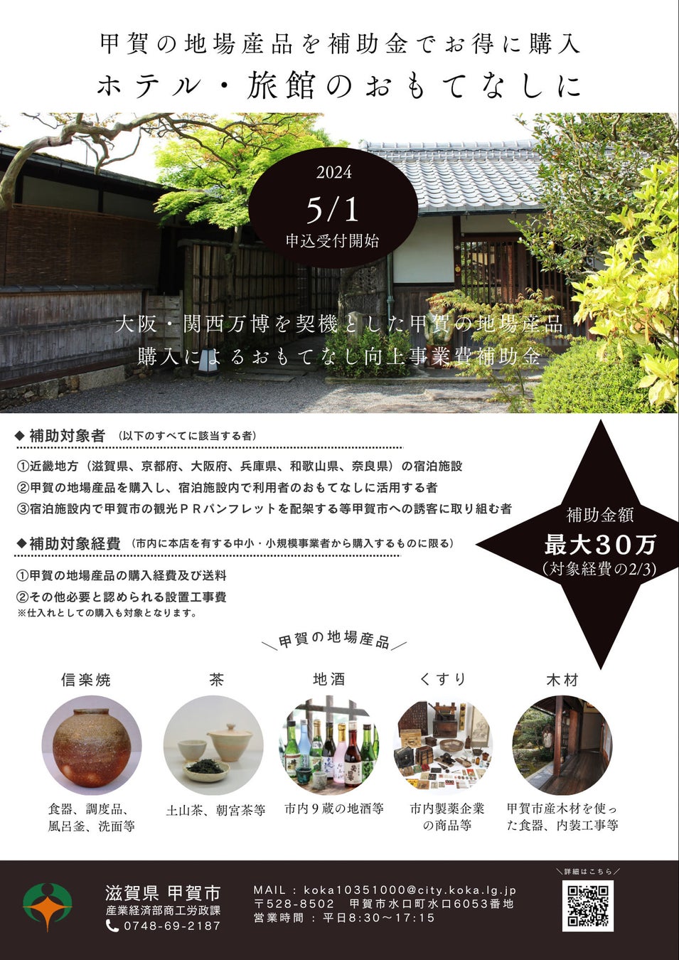 滋賀県甲賀市の地場産品(信楽焼・茶・地酒・薬・甲賀市産木材)を、お客様の「おもてなし」のために購入される近畿地方の宿泊施設に対し、最大30万円を補助します。