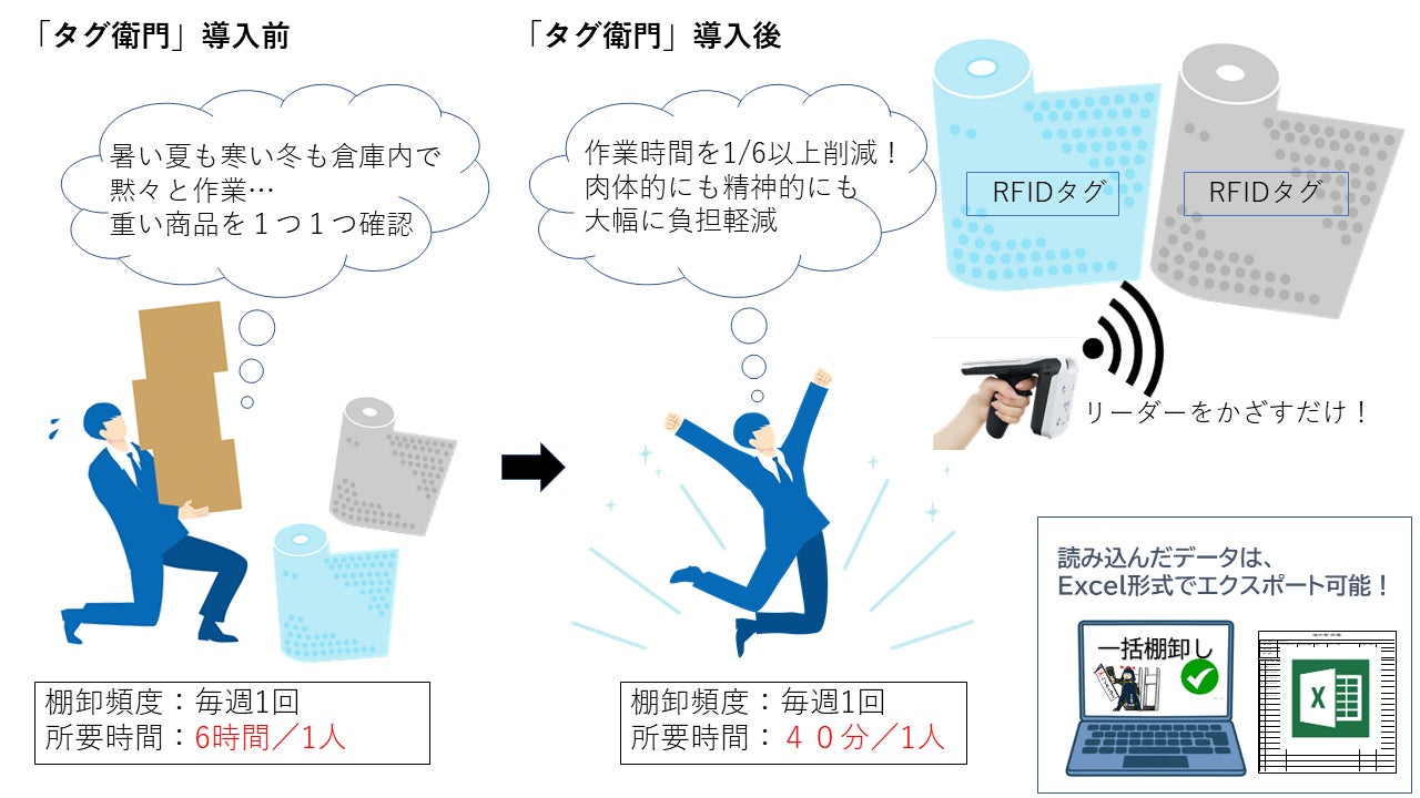 「タグ衛門(RFID(ICタグ))」で棚卸の肉体的・精神的負担を大幅に軽減!労働時間削減・業務改善・ペーパーレス化・情報の一元管理を実現