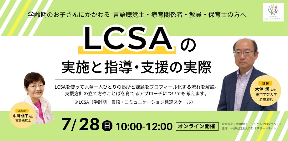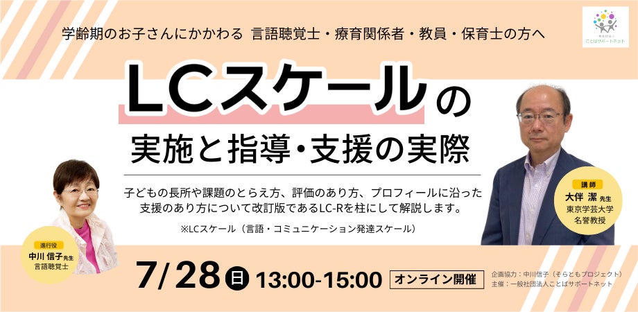 一般社団法人ことばサポートネットは、子どもの言語コミュニケーション発達を基盤に作成された検査法であるLCスケールとLCSAについて、著者の大伴潔先生(東京学芸大学名誉教授)を講師に、言語聴覚士の中川信子先生を進行・助言役に招き、"検査の実施と支援・指導の実際"について学ぶオンライン講座を開催いたします。