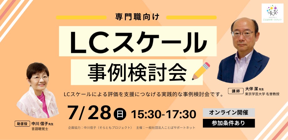 一般社団法人ことばサポートネットは、7月28日(日)「LCスケール」に関連した連続講座を開催します。講師には東京学芸大学名誉教授大伴潔先生、進行・助言役には言語聴覚士の中川信子先生をお迎えいたします。