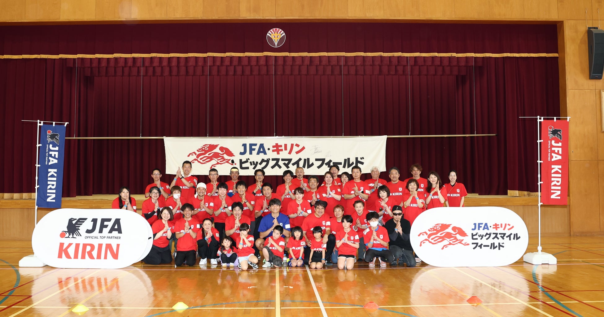 キリンホールディングス株式会社(社長 COO 南方健志、以下キリン)と、公益財団法人日本サッカー協会(会長 宮本恒靖、以下JFA)は共同で、2024年1月1日に発生した能登半島地震の復興応援プロジェクト「JFA・キリン ビッグスマイルフィールド」を昨年5月から継続して実施してきました。今回はその第7回目として「JFA・キリン ビッグスマイルフィールド in輪島市町野地区」を6月14日(土)に石川県輪島市立東陽中学校にて開催しました。開催地域の輪島市町野地区では、サッカー日本代表の町野修斗選手と地区の名前が同じというご縁から、兼ねてより地区をあげて町野選手の応援に取り組んでいます。その熱がこもった応援は町野選手ご本人にも届いており、この度初めて町野選手がサプライズでの現地訪問が実現しました。当日は元サッカー日本代表の永島昭浩さん、中西永輔さんもゲストとして登場し、老若男女で楽しめる “歩いて行うサッカー“ウォーキングフットボールや交流会を通して、被災地に笑顔を届けました。町野選手をずっと応援されていた、町野地区から参加の50代の女性は満面の笑顔で「応援していた町野選手に来場いただけるなんてびっくりでした。本当に嬉しかったです!」といった感想や、小学1年生の女の子は「おじいちゃんと一緒にできて楽しかったです。またやりたいです」など笑顔でお話しをいただきました。