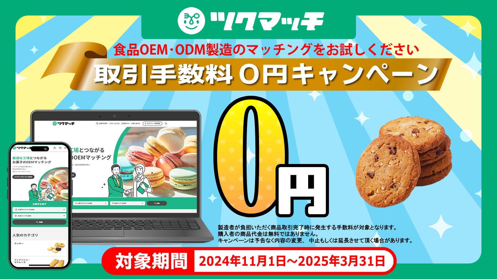 食品OEM取引をオンラインで効率的にマッチングするサービス「ツクマッチ」が取引手数料0円でご利用いただけるキャンペーンを2024年11月1日から2025年3月31日まで実施いたします。