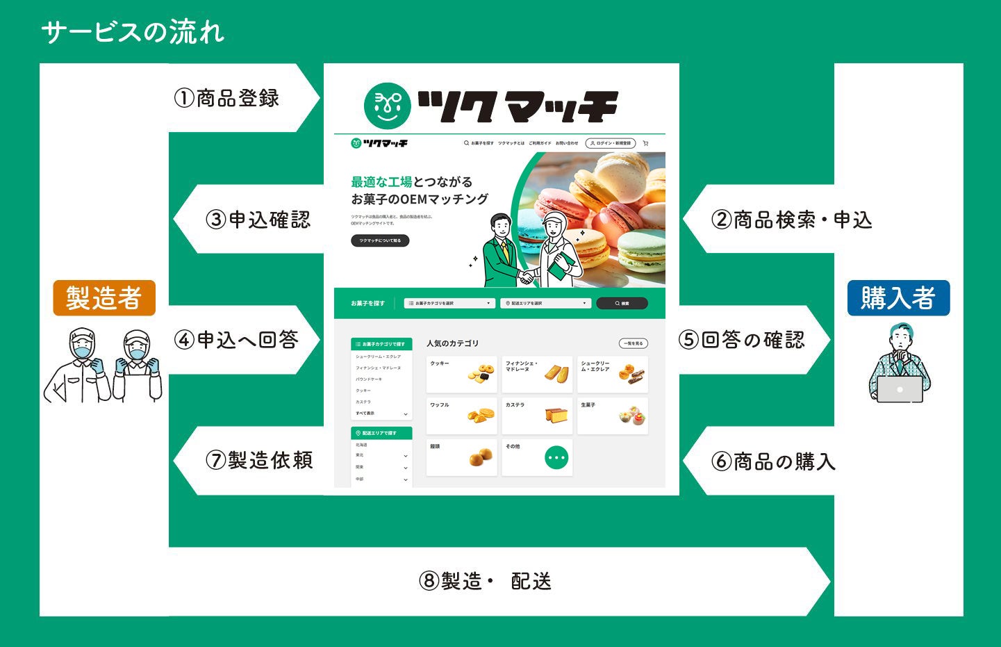 ツクマッチは、1957年設立の菓子製造機械メーカーである株式会社マスダックが運営する、お菓子を中心とした食品のOEMマッチングサイトです。お菓子の製造者と購入者をインターネット上で繋ぎます。食品ODM商品の売買取引がオンライン上で可能となる他、食品OEM製造委託について相談していただけるコンシェルジュサービスも用意して食品OEMをサポートいたします。