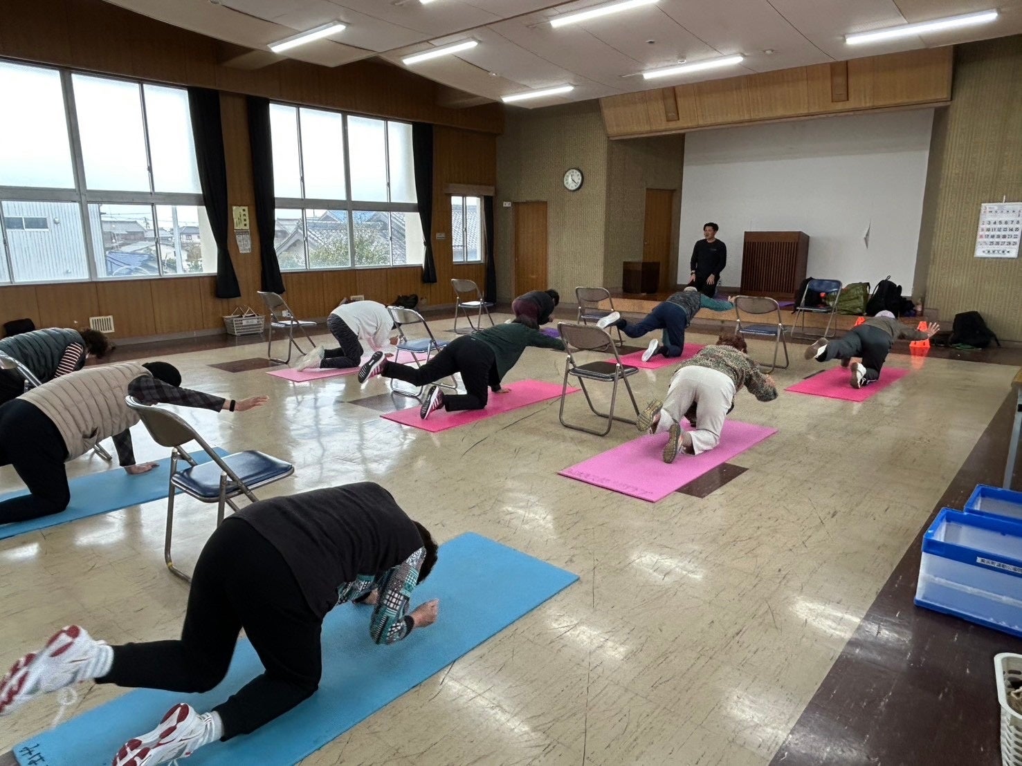公民館に集まり、ヨガマットを使用したストレッチや呼吸法など、機能改善に効果的な運動を各回参加者の状態を見ながら実施しました。