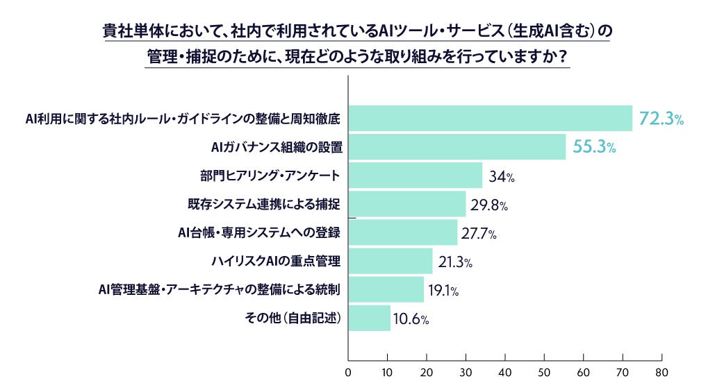 ・AI利用に関する社内ルール整備は72.3%、AIガバナンス組織の設置は55.3%の企業が実施