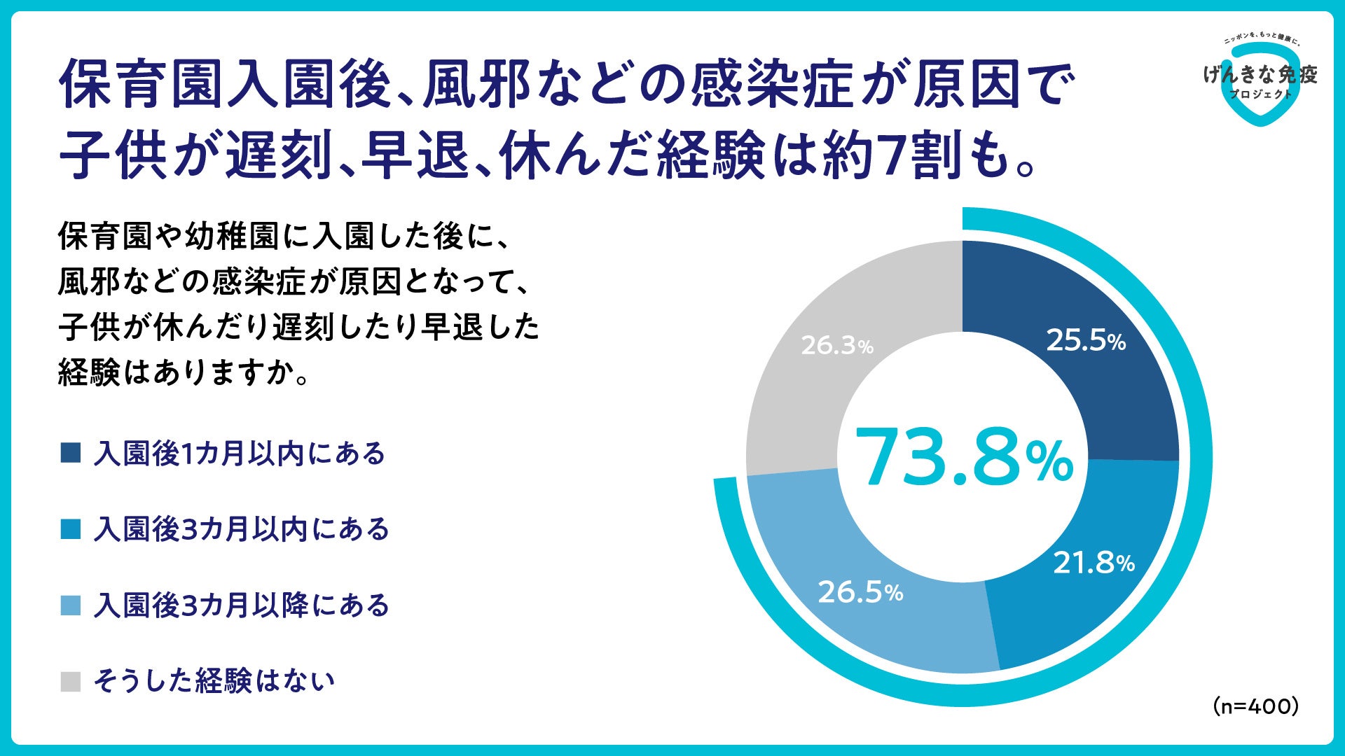 3.「保育園の洗礼」で風邪などの感染症が原因で子供が遅刻、早退、休んだ経験は7割以上(73.8%)にものぼり、園児が入園後に感染症にかかったと回答しました。「保育園の洗礼」の時期は、体調管理に注意すべきタイミングあることがわかりました。