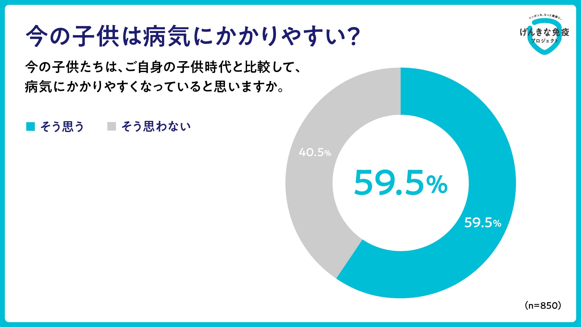 1.「自分の子供たちは、自身の子供時代と比較して病気にかかりやすくなっているか」の質問に対して、約6割(59.5%)の方がかかりやすくなったと回答しました。