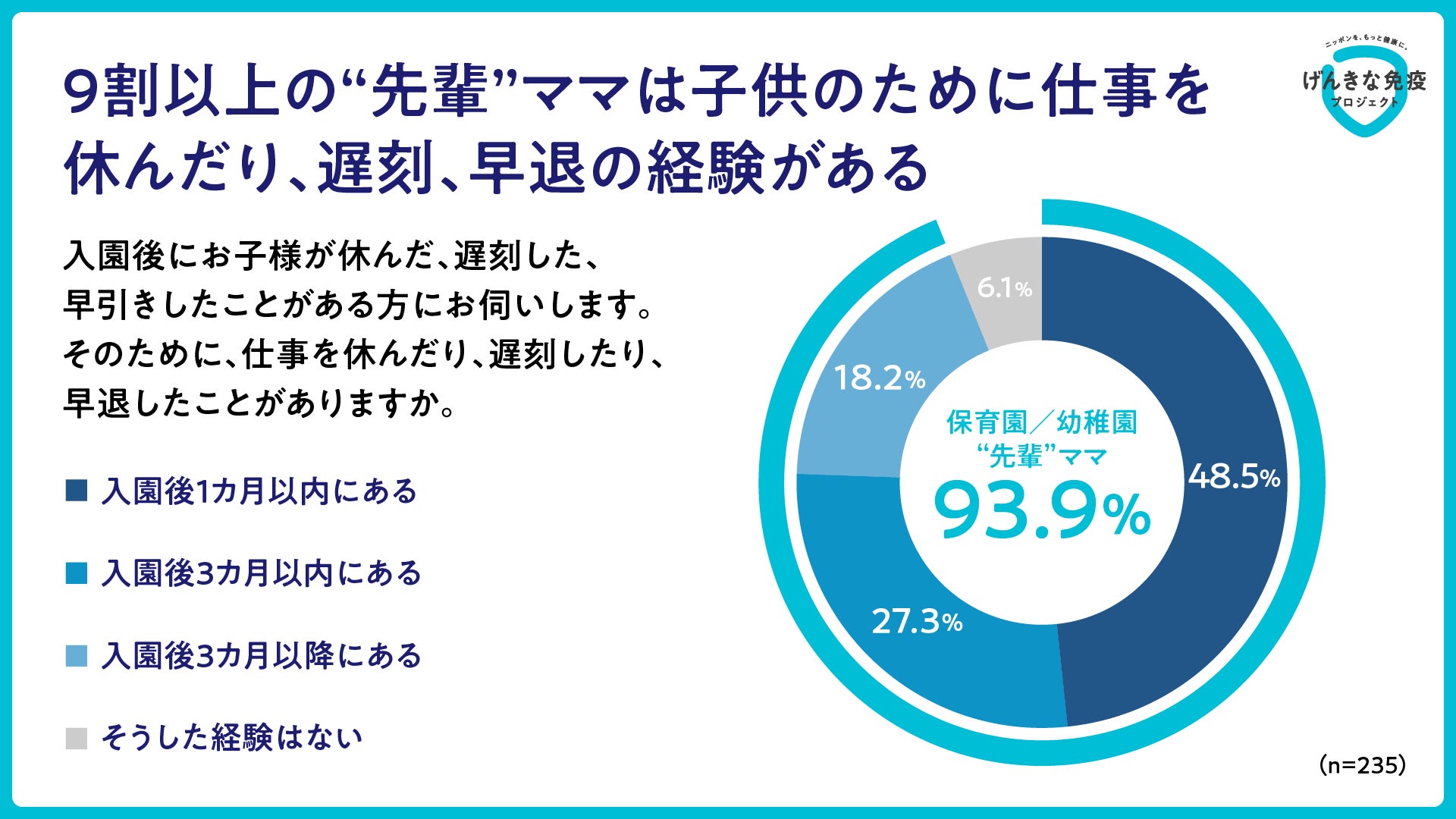 調査の結果、「保育園の洗礼」による感染症を理由に早退や欠席をした経験がある園児は7割以上という結果になりました。また子供の体調不良により、仕事を休む・遅刻・早退した経験があるママは9割以上にのぼり、「保育園の洗礼」がママに大きな負担をかけていることが明らかになりました。さらに、入園後、子供の感染症が原因で家族に感染が広がる家庭内感染を経験したママ・パパは約9割に達しました。「保育園の洗礼」による感染症は家族全員に影響を及ぼすため、親子や家族全員で健康管理を行うことの重要性が伺えます。