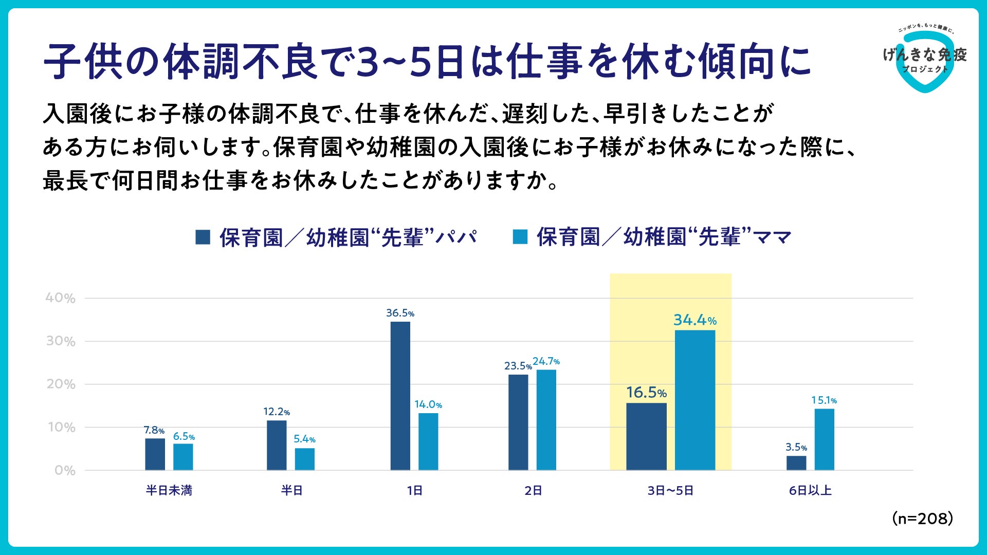 4.入園後に子供の体調不良を理由に、自身の仕事を遅刻、早退、休んだ経験のある先輩ママは9割超(93.9%)、特に入園1か月以内は約5割(48.5%)のママが経験したと回答しました。また「子供の感染症を理由に休んだ際、最長で何日休んだか」という質問に対しては「3~5日」が3割(34.4%)と最も高く、入園後の感染症による子供の体調不良は、ママにも大きな負担となることが明らかになりました。