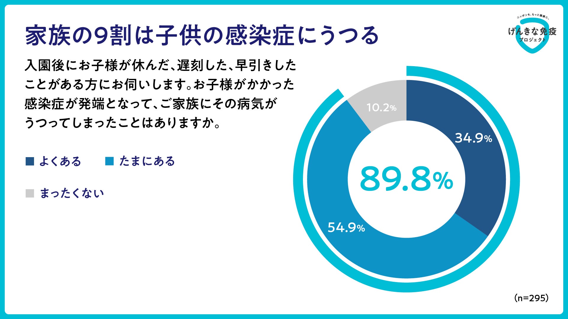 5.入園後に子供がかかってしまった感染症が家族に移ってしまう、いわゆる「家庭内感染」の経験有無を聞いたところ、約9割(89%)ものママ・パパが経験したことがあると回答しました。春に多く起こる「保育園の洗礼」は「家庭内感染」を引き起こすことから、家族全員が健康管理や「免疫のケア」に