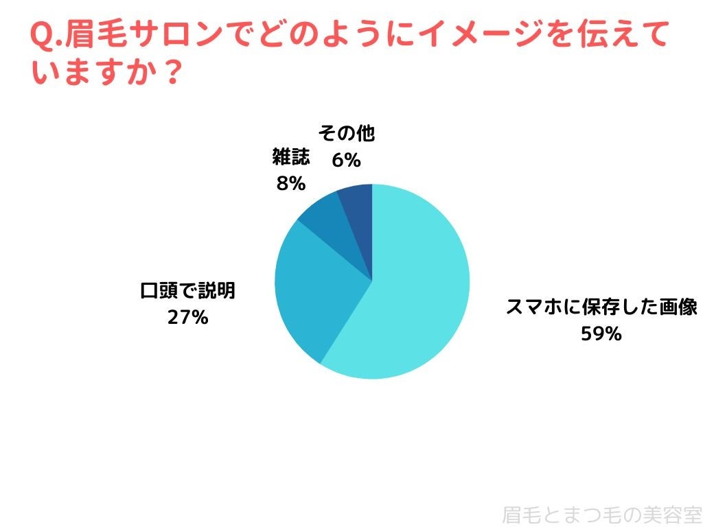 眉毛サロンでイメージを伝えるとき「スマホに保存した画像(59%)」が最も多いという結果になりました。次いで「口頭で説明(27%)」、「雑誌(8%)」という順になっています。