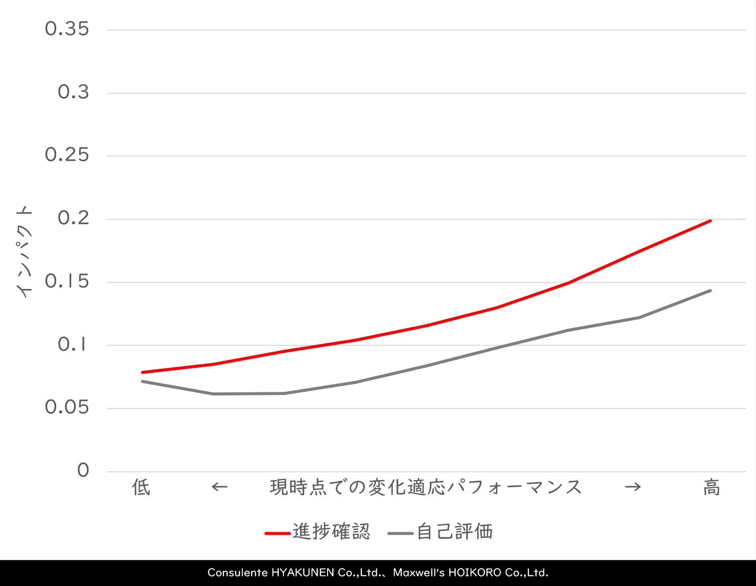 次に図2を見てください。これは、計画的学習の「進捗確認」と「自己評価」の2つのステップについて解析した結果です。まず、「進捗確認」が右上がり、すなわち「変化適応」ができるようになるにつれて「進捗確認」の重要性が増していくことが分かります。それに加えて、「進捗確認」が「自己評価」の上に位置していることから、その重要性は「自己評価」より高いと言えます。