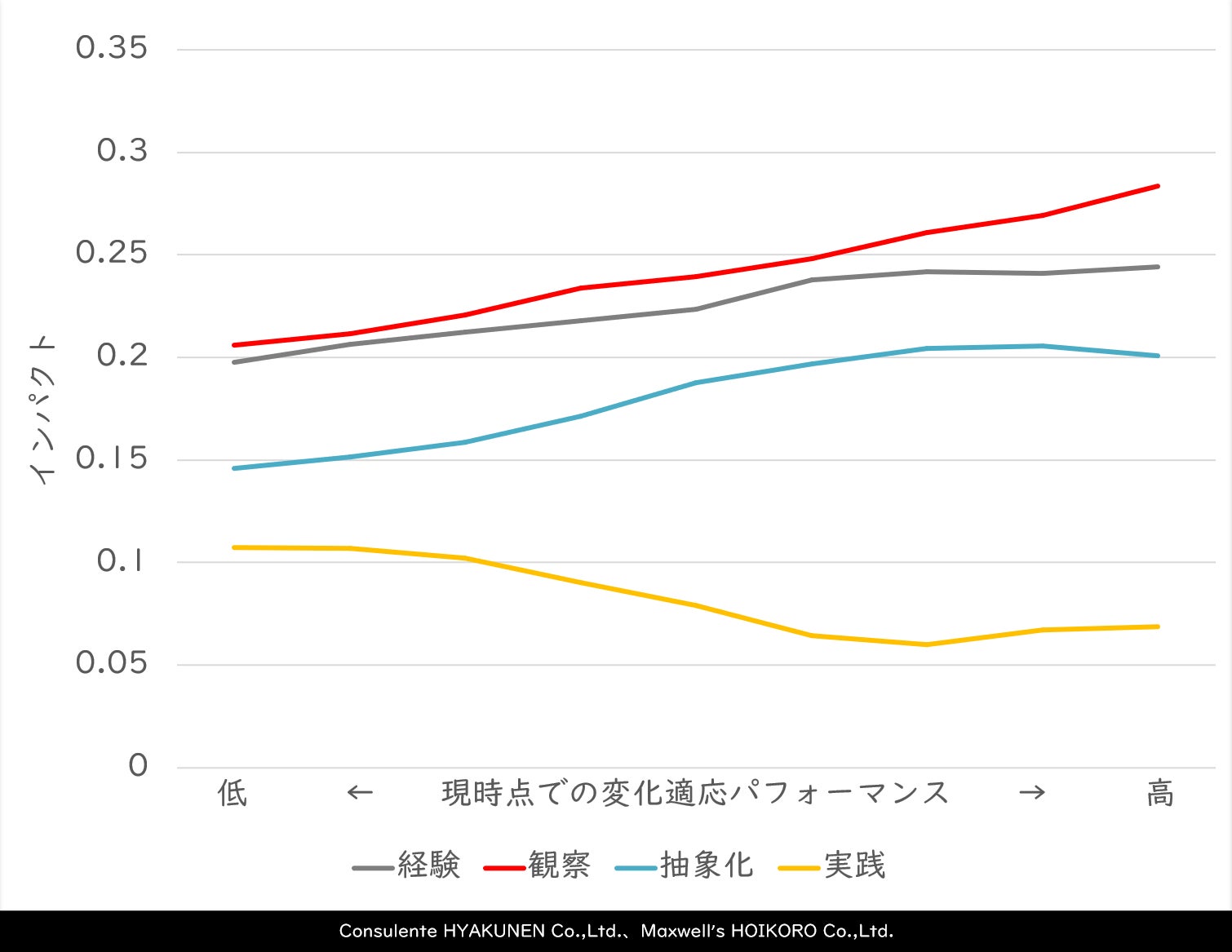 グラフの横軸は「現時点で変化適応のパフォーマンスが発揮されている度合い」を示しています。赤色と灰色の線が右上がりであることから、「変化適応」できるようになればなるほど、OJTにおいて「経験」と「観察」の経験学習が重要になるのです。