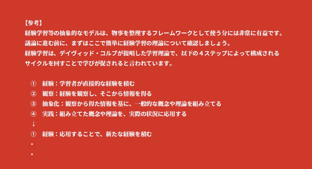 調査と解析の結果を先取りすると、「変化適応」や「変化創出」ができる人材を育てるためには、経験学習の4つのステップのうち、「経験(学習者が直接的な経験を積む)」や「抽象化(観察から得た情報を基に一般的な概念や理論を組み立てる)」が重要であると分かりました。言い換えると、仕事での「経験」を「抽象化」することで教訓を得る、というプロセスが、「変化適応」や「変化創出」人材の育成に必要であるということです。