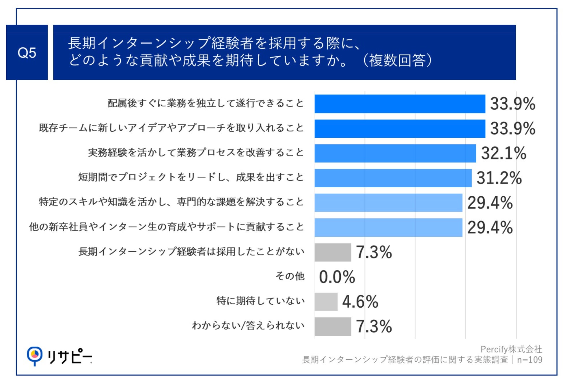 「Q5.長期インターンシップ経験者を採用する際に、どのような貢献や成果を期待していますか。(複数回答)」(n=109)と質問したところ、「配属後すぐに業務を独立して遂行できること」が33.9%、「既存チームに新しいアイデアやアプローチを取り入れること」が33.9%、「実務経験を活かして業務プロセスを改善すること」が32.1%、「短期間でプロジェクトをリードし、成果を出すこと」が32.1%という回答となりました。